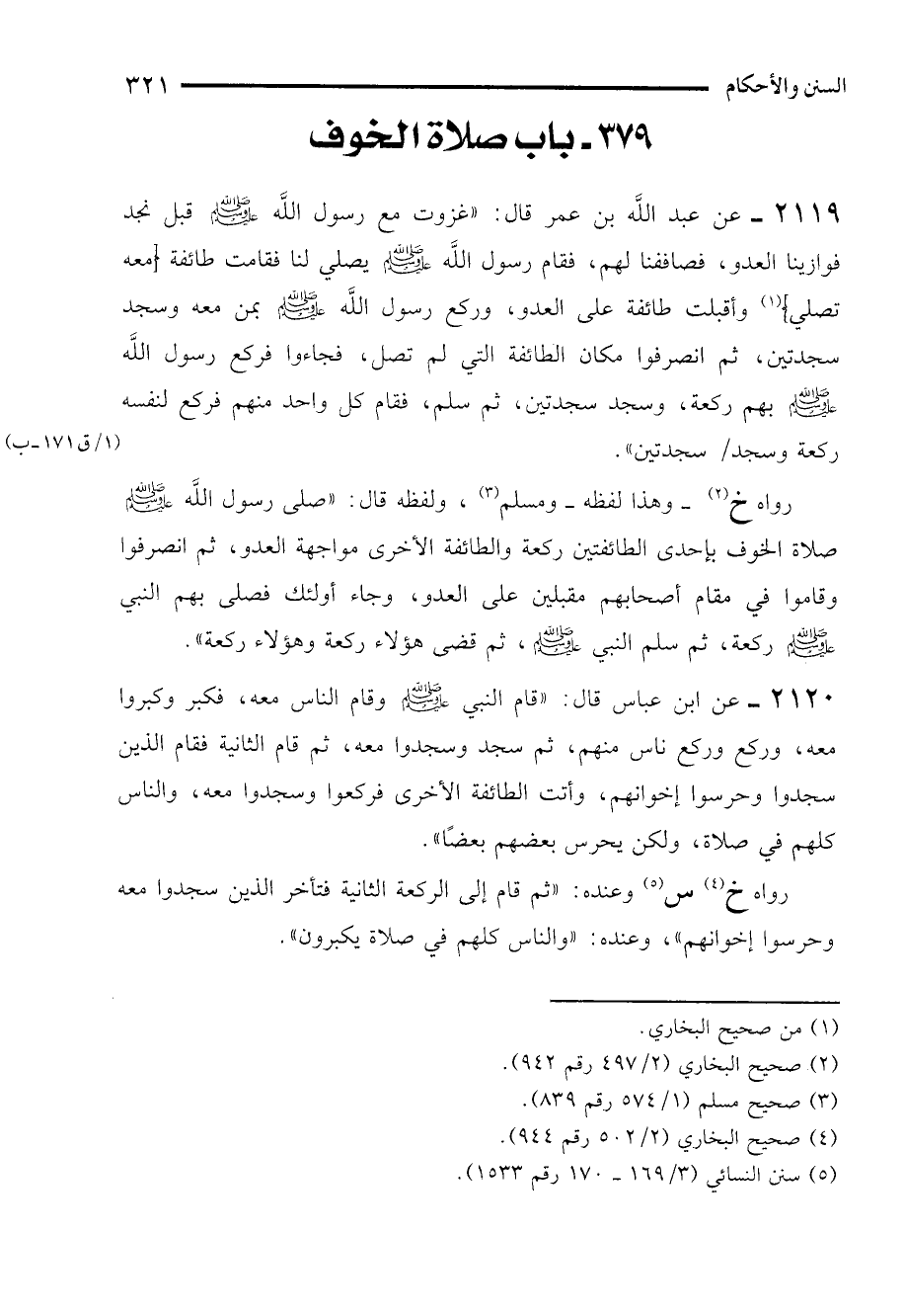 2120 - عن ابن عباس قال: "قام النبي - صلى الله عليه وسلم - وقام الناس معه، فكبر وكبروا معه، وركع وركع ناس منهم، ثم سجد وسجدوا معه، ثم قام الثانية فقام الذين سجدوا وحرسوا إخوانهم، وأتت الطائفة الأخرى فركعوا وسجدوا معه، والناس كلهم في صلاة، ولكن يحرس بعضهم بعضًا".
