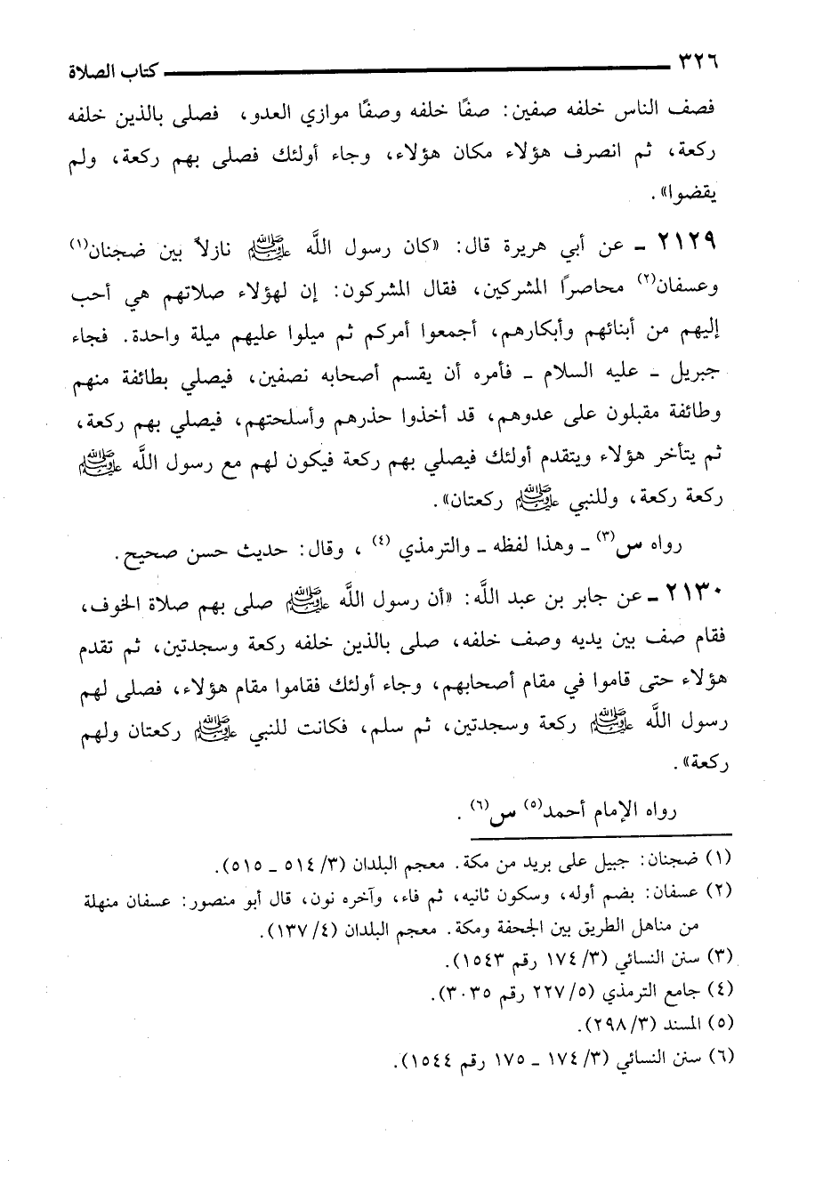2129 - عن أبي هريرة قال: "كان رسول الله - صلى الله عليه وسلم - نازلًا بين ضجنان (¬1) وعسفان (¬2) محاصرًا المشركين، فقال المشركون: إن لهؤلاء صلاتهم هي أحب إليهم من أبنائهم وأبكارهم، أجمعوا أمركم ثم ميلوا عليهم ميلة واحدة. فجاء جبريل -عليه السلام- فأمره أن يقسم أصحابه نصفين، فيصلي بطائفة منهم وطائفة مقبلون على عدوهم، قد أخذوا حذرهم وأسلحتهم، فيصلي بهم ركعة، ثم يتأخر هؤلاء ويتقدم أولئك فيصلي بهم ركعة فيكون لهم مع رسول الله - صلى الله عليه وسلم - ركعة ركعة، وللنبي - صلى الله عليه وسلم - ركعتان".