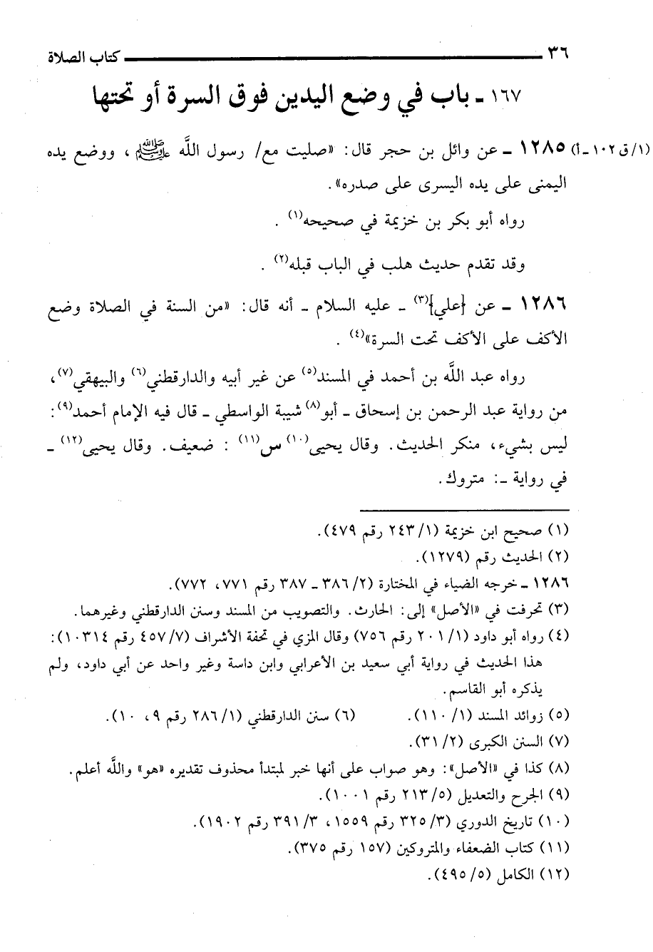 1286 - عن (علي) (¬3) -عليه السلام- أنه قال: "من السنة في الصلاة وضع الأكف على الأكف تحت السرة" (¬4).