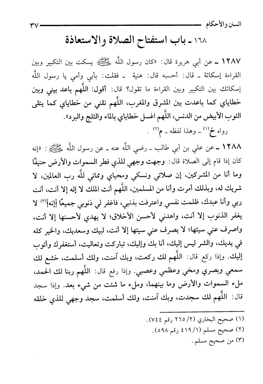 1287 - عن أبي هريرة قال: "كان رسول الله - صلى الله عليه وسلم - يسكت بين التكبير وبين القراءة إسكاتة -قال: أحسبه قال: هنية- فقلت: بأبي وأمي يا رسول الله إسكاتك بين التكبير وبين القراءة ما تقول؟ قال: أقول: اللَّهم باعد بيني وبين خطاياي كما باعدت بين المشرق والمغرب، اللَّهم نقني من خطاياي ما ينقى الثوب الأبيض من الدنس، اللهم اغسل خطاياي بالماء والثلج والبرد".