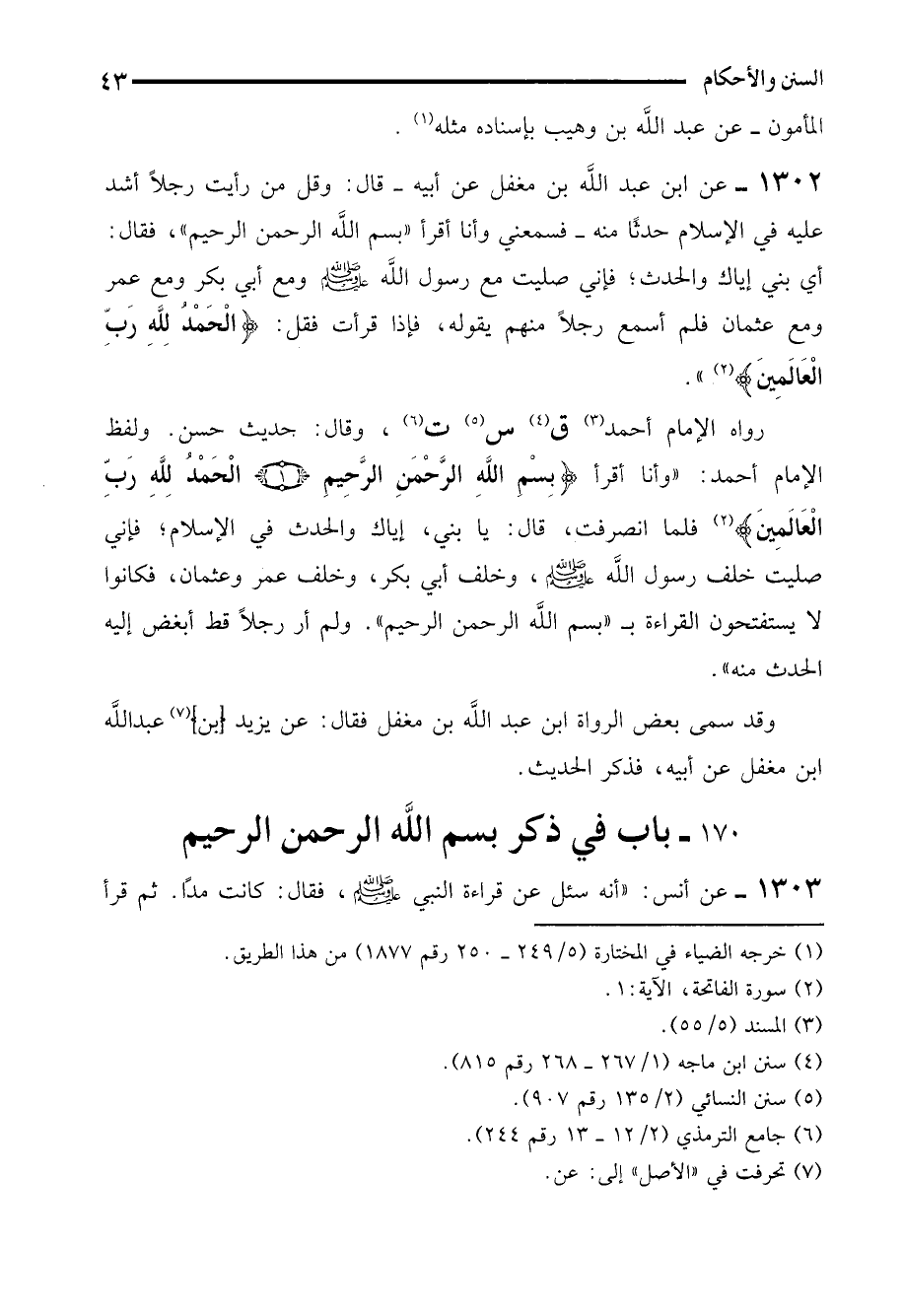 1302 - عن ابن عبد الله بن مغفل عن أبيه -قال: وقل من رأيت رجلاً أشد عليه في الإسلام حدثًا منه- فسمعني وأنا أقرأ "بسم الله الرحمن الرحيم"، فقال: أي بني إياك والحدث؛ فإني صليت مع رسول الله - صلى الله عليه وسلم - ومع أبي بكر ومع عمر ومع عثمان فلم أسمع رجلاً منهم يقوله، فإذا قرأت فقل: (الْحَمْدُ لِلَّهِ رَبِّ الْعَالَمِينَ) (¬2) ".