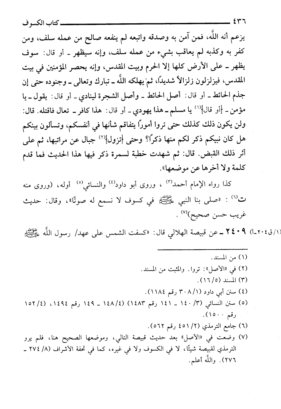 2409 - عن قبيصة الهلالي قال: "كسفت الشمس على عهد رسول الله - صلى الله عليه وسلم -