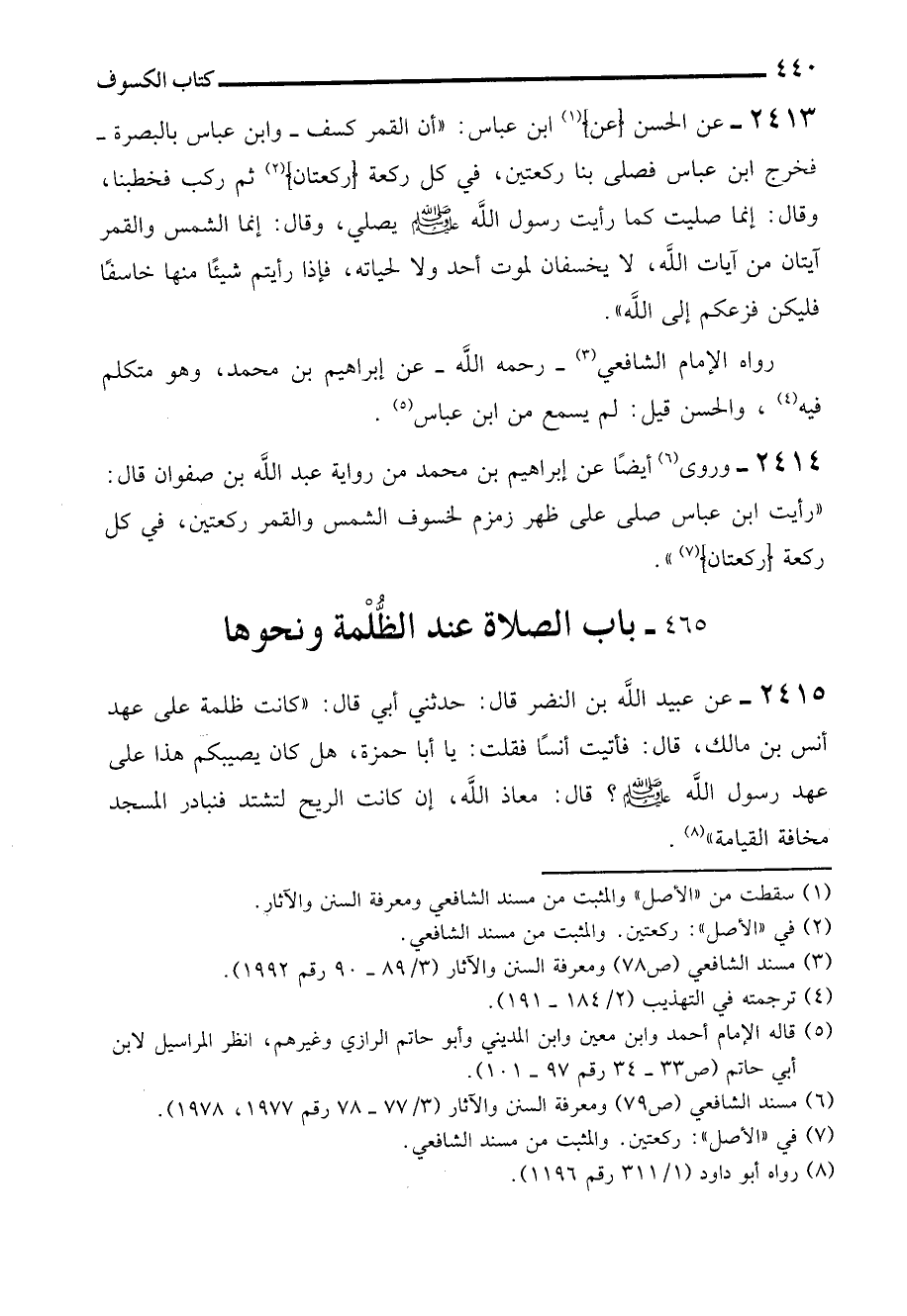 2414 - وروى (¬6) أيضًا عن إبراهيم بن محمد من رواية عبد الله بن صفوان قال: "رأيت ابن عباس صلى على ظهر زمزم لخسوف الشمس والقمر ركعتين، في كل ركعة (ركعتان) (¬7) ".