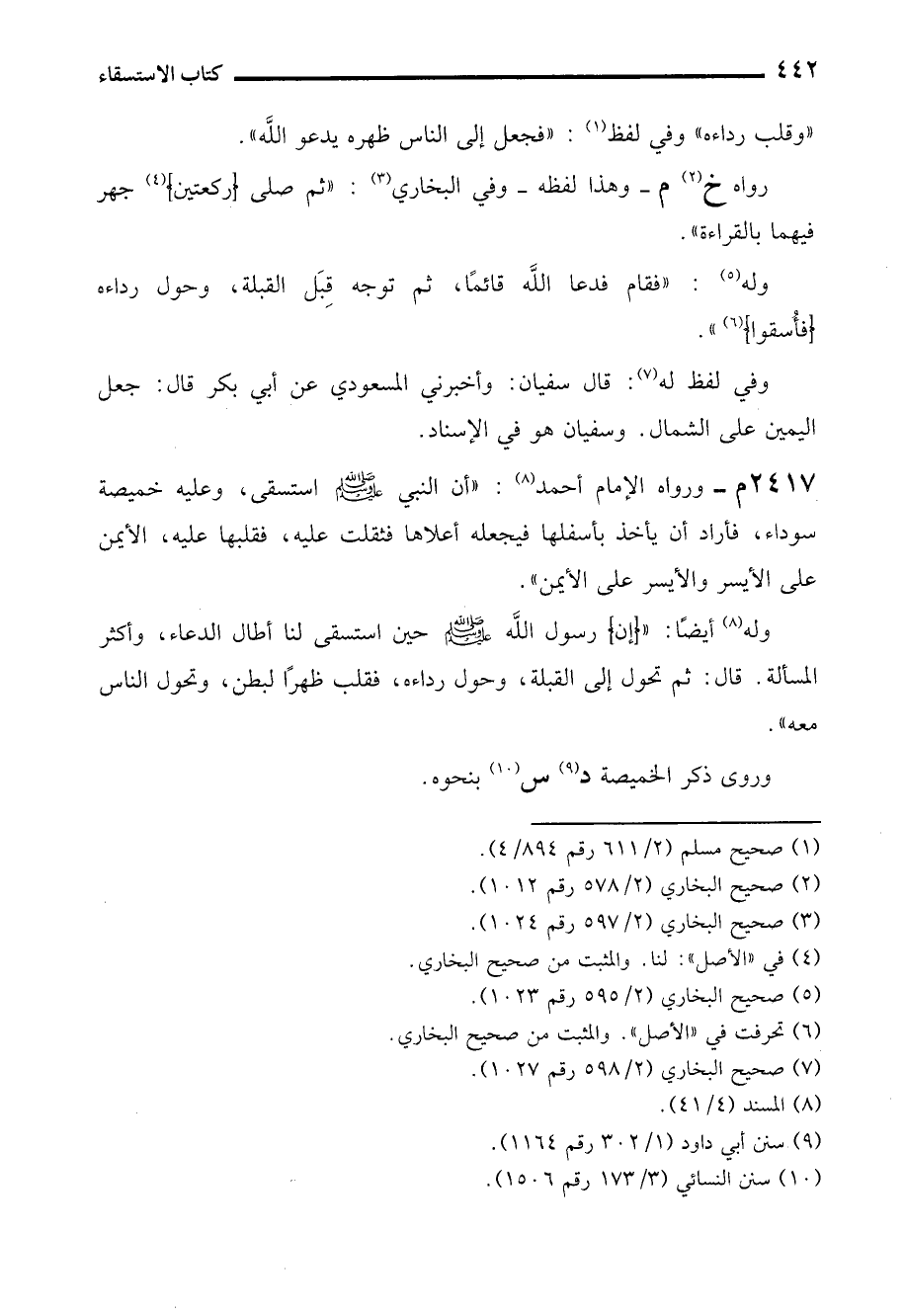 2417م- ورواه الإمام أحمد (¬8): "أن النبي - صلى الله عليه وسلم - استسقى، وعليه خميصة سوداء، فأراد أن يأخذ بأسفلها فيجعله أعلاها فثقلت عليه، فقلبها عليه، الأيمن على الأيسر والأيسر على الأيمن".