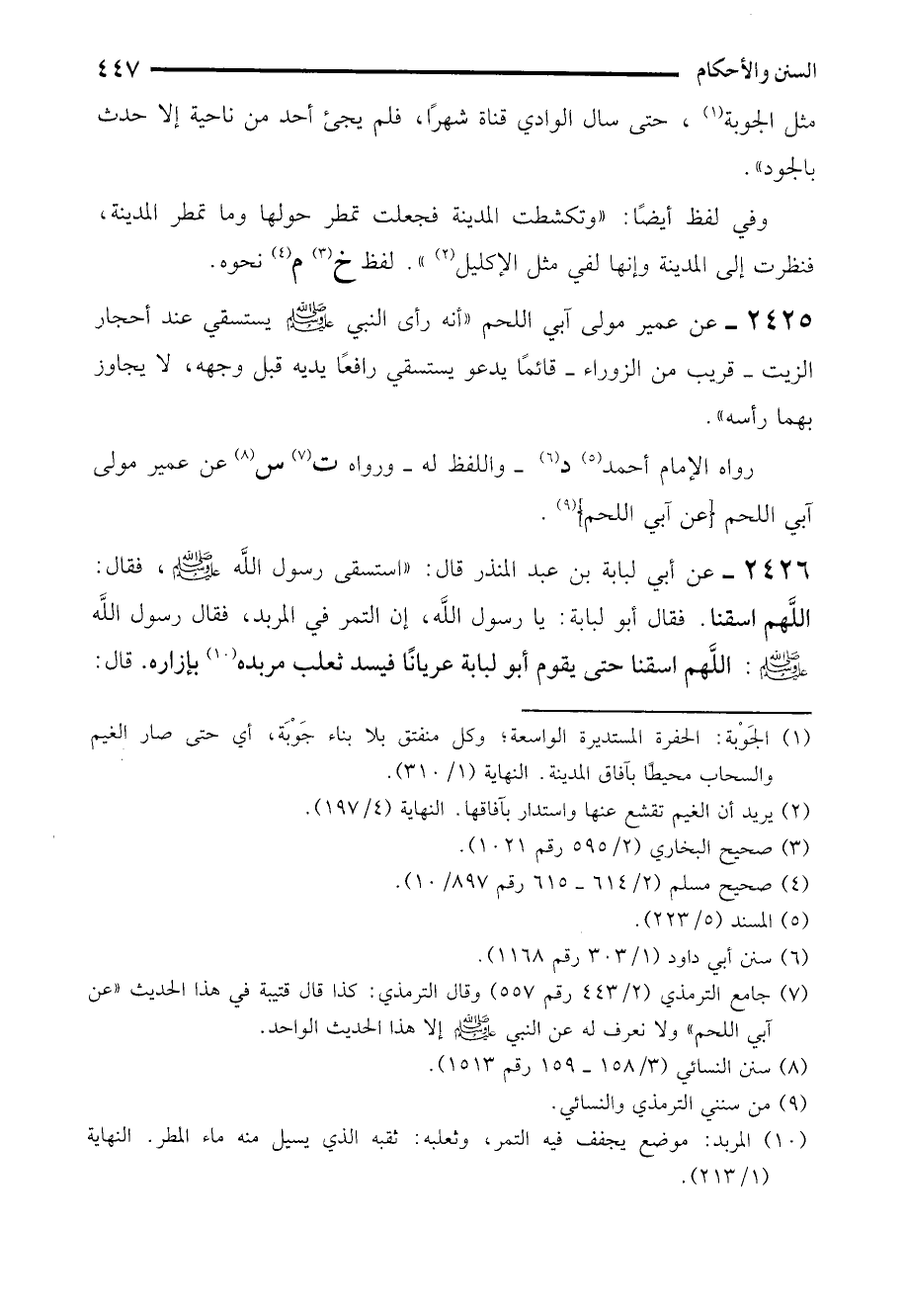 2426 - عن أبي لبابة بن عبد المنذر قال: "استسقى رسول الله - صلى الله عليه وسلم -، فقال: اللَّهم اسقنا. فقال أبو لبابة: يا رسول الله، إن التمر في المربد، فقال رسول الله - صلى الله عليه وسلم -: اللَّهم اسقنا حتى يقوم أبو لبابة عريانًا فيسد ثعلب مربده (¬10) بإزاره. قال: