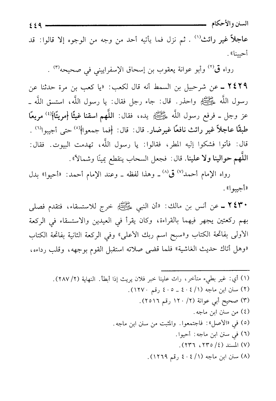 2429 - عن شرحبيل بن السمط أنه قال لكعب: "يا كعب بن مرة حدثنا عن رسول الله - صلى الله عليه وسلم - واحذر. قال: جاء رجل فقال: يا رسول الله، استسق الله -عز وجل- فرفع رسول الله - صلى الله عليه وسلم - يده، فقال: اللَّهم اسقنا غيثًا (مريئًا) (¬4) مريعًا طبقًا عاجلاً غير رائث نافعًا غير ضار. قال: قال: (فما جمعوا) (¬5) حتى أجيبوا (¬6). قال: فأتوا فشكوا إليه المطر، فقالوا: يا رسول الله، تهدمت البيوت. فقال: اللهم حوالينا ولا علينا. قال: فجعل السحاب ينقطع يمينًا وشمالًا".