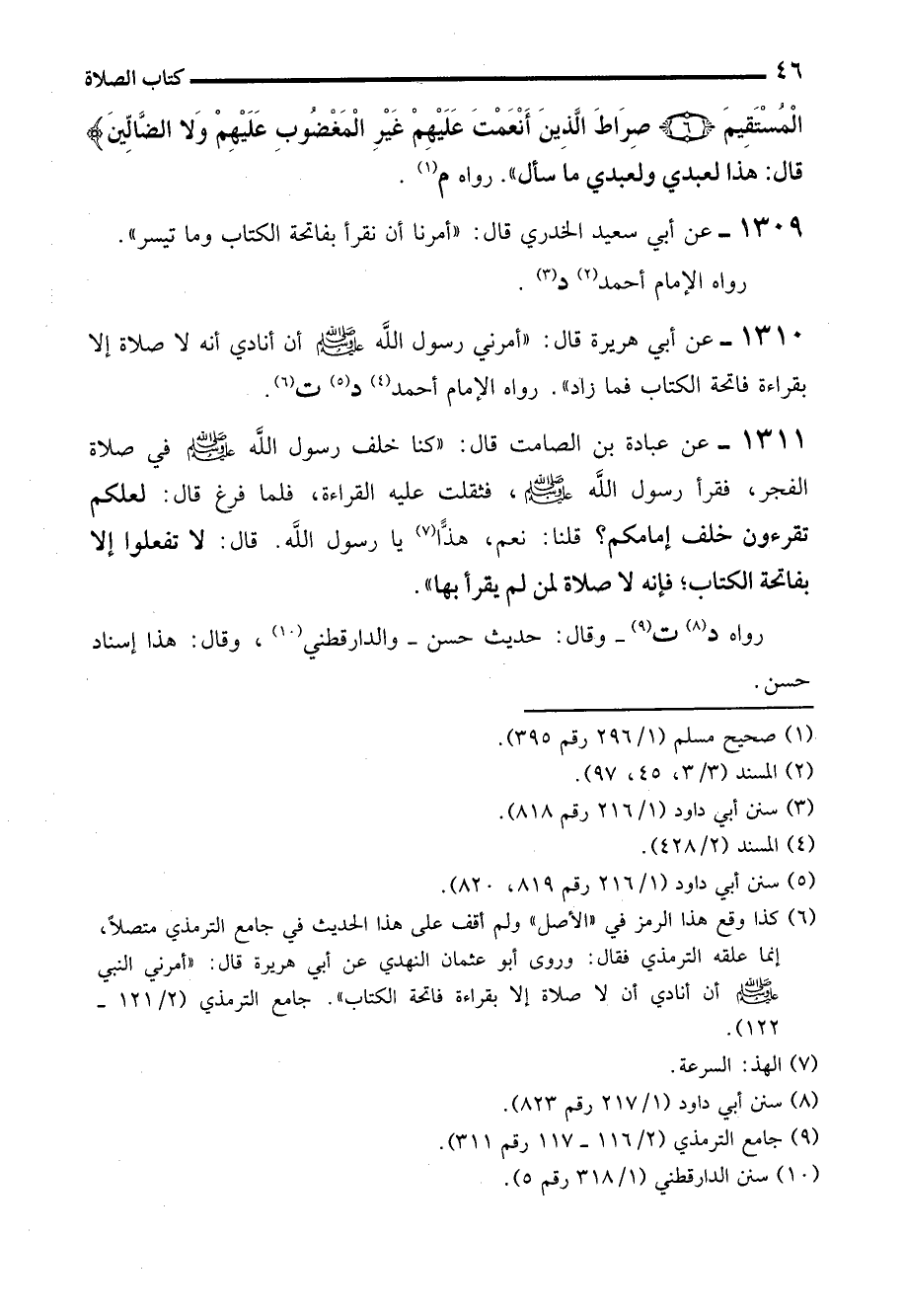1310 - عن أبي هريرة قال: "أمرني رسول الله - صلى الله عليه وسلم - أن أنادي أنه لا صلاة إلا بقراءة فاتحة الكتاب فما زاد". رواه الإمام أحمد (¬4) د (¬5) ت (¬6).