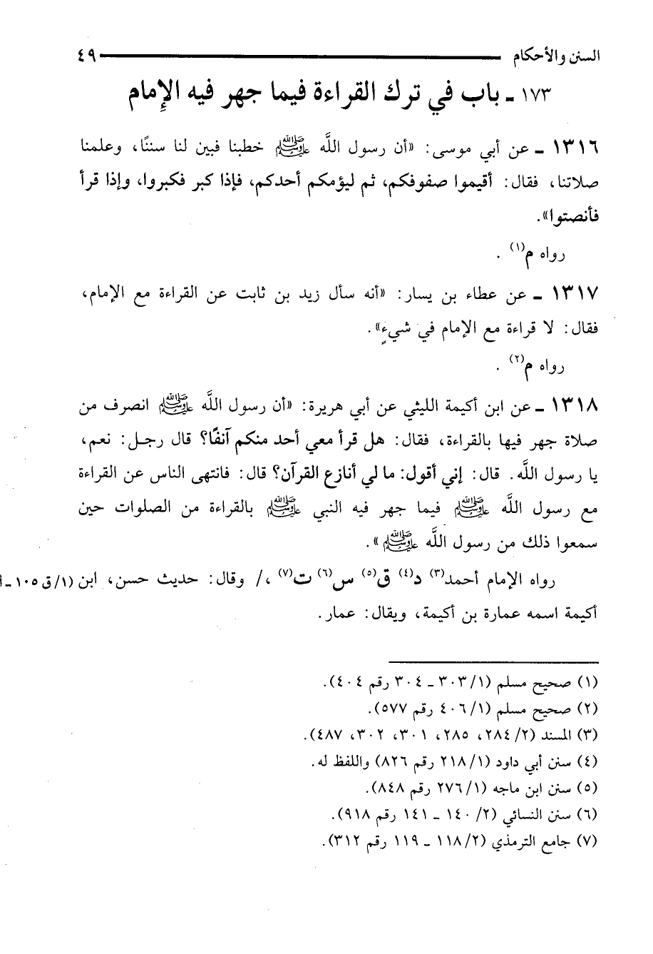 1318 - عن ابن أكيمة الليثي عن أبي هريرة: "أن رسول الله - صلى الله عليه وسلم - انصرف من صلاة جهر فيها بالقراءة، فقال: هل قرأ معي أحد منكم آنفًا؟ قال رجل: نعم، يا رسول الله. قال: إني أقول: ما لي أنازع القرآن؟ قال: فانتهى الناس عن القراءة مع رسول الله - صلى الله عليه وسلم - فيما جهر فيه النبي - صلى الله عليه وسلم - بالقراءة من الصلوات حين سمعوا ذلك من رسول الله - صلى الله عليه وسلم -".