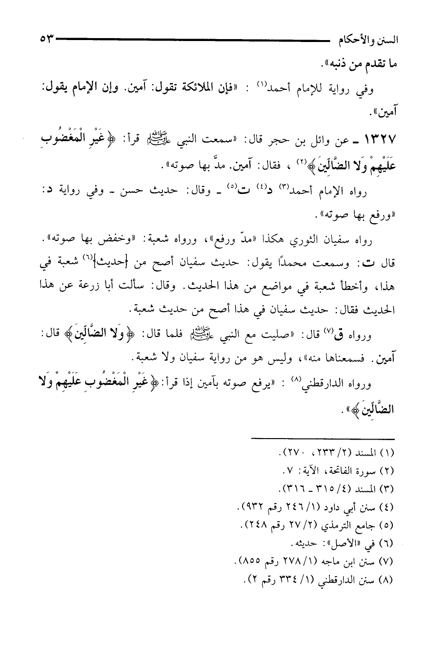 1327 - عن وائل بن حجر قال: "سمعت النبي - صلى الله عليه وسلم - قرأ: (غَيْرِ الْمَغْضوبِ عَلَيْهِمْ وَلَا الضَّالِّينَ) (¬2)، فقال: آمين. مدَّ بها صوته".
