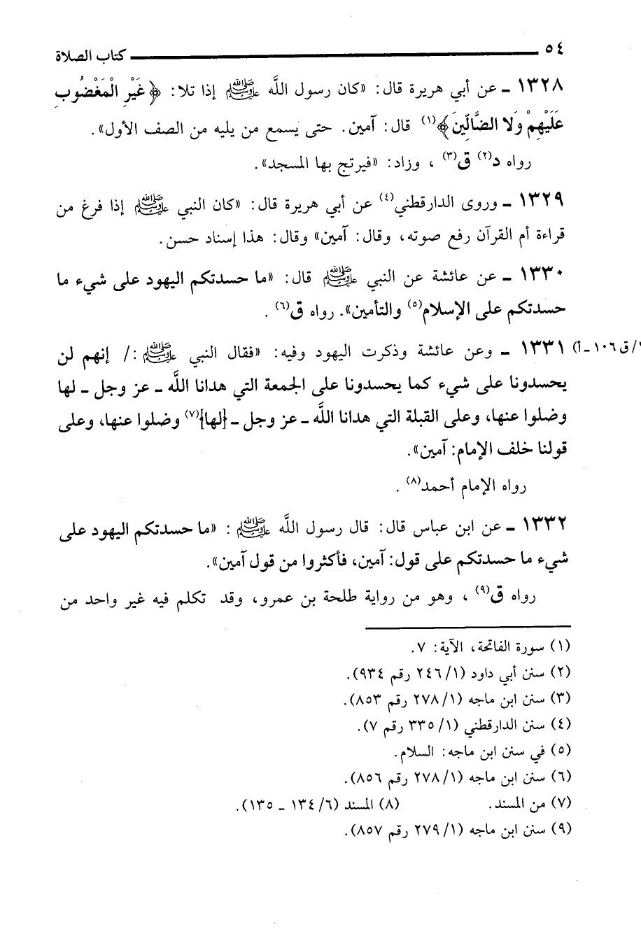 1330 - عن عائشة عن النبي - صلى الله عليه وسلم - قال: "ما حسدتكم اليهود على شيء ما حسدتكم على الإسلام (¬5) والتأمين". رواه ق (¬6).