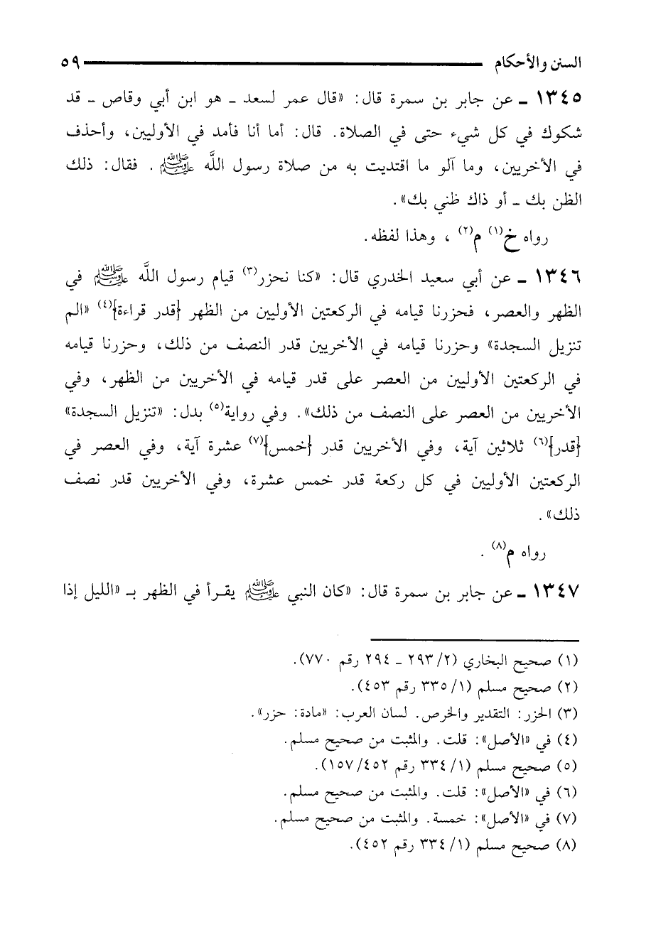1346 - عن أبي سعيد الخدري قال: "كنا نحزر (¬3) قيام رسول الله - صلى الله عليه وسلم - في الظهر والعصر، فحزرنا قيامه في الركعتين الأوليين من الظهر (قدر قراءة) (¬4) "الم تنزيل السجدة" وحزرنا قيامه في الأخريين قدر النصف من ذلك، وحزرنا قيامه في الركعتين الأوليين من العصر على قدر قيامه في الأخريين من الظهر، وفي الأخريين من العصر على النصف من ذلك". وفي رواية (¬5) بدل: "تنزيل السجدة" (قدر) (¬6) ثلاثين آية، وفي الأخريين قدر (خمس) (¬7) عشرة آية، وفي العصر في الركعتين الأوليين في كل ركعة قدر خمس عشرة، وفي الأخريين قدر نصف ذلك".