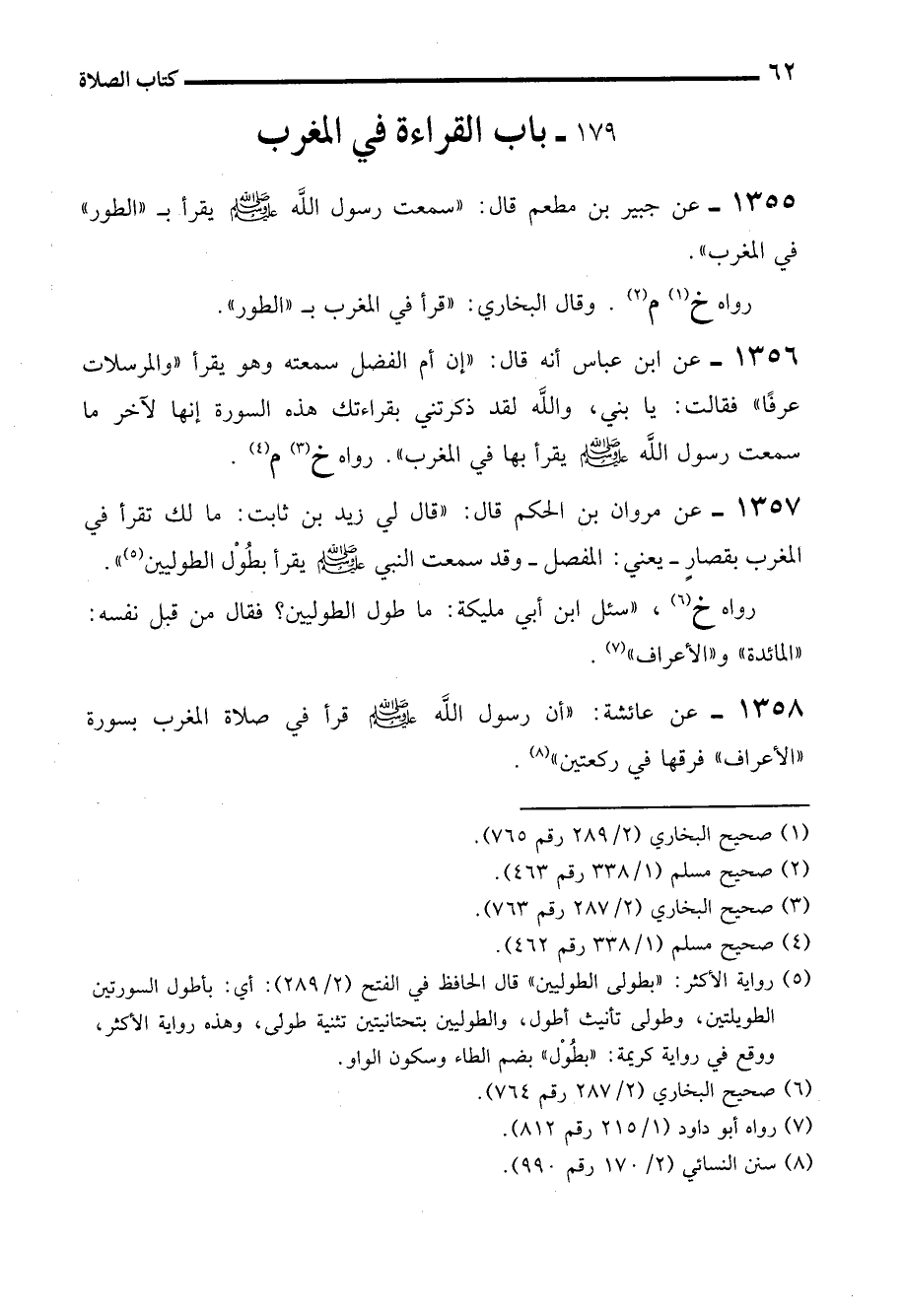 1358 - عن عائشة: "أن رسول الله - صلى الله عليه وسلم - قرأ في صلاة المغرب بسورة "الأعراف" فرقها في ركعتين" (¬8).