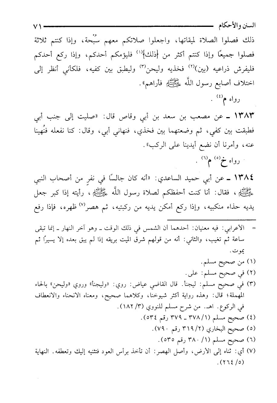 1383 - عن مصعب بن سعد بن أبي وقاص قال: "صليت إلى جنب أبي فطبقت بين كفي، ثم وضعتهما بين فخذي، فنهاني أبي، وقال: كنا نفعله فنُهينا عنه، وأمرنا أن نضع أيدينا على الركب".