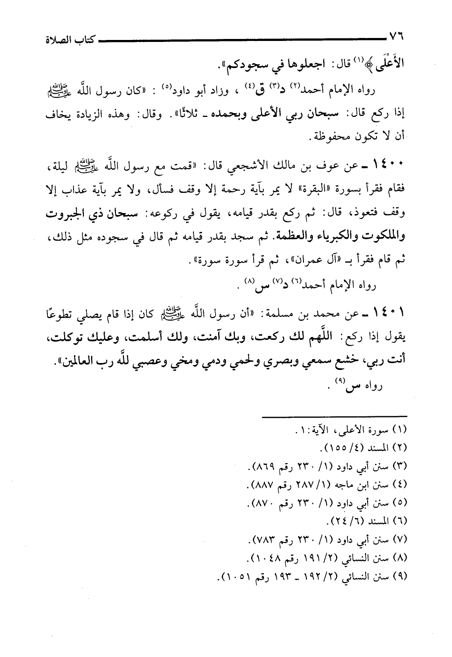 1400 - عن عوف بن مالك الأشجعي قال: "قمت مع رسول الله - صلى الله عليه وسلم - ليلة، فقام فقرأ بسورة "البقرة" لا يمر بآية رحمة إلا وقف فسأل، ولا يمر بآية عذاب إلا وقف فتعوذ، قال: ثم ركع بقدر قيامه، يقول في ركوعه: سبحان ذي الجبروت والملكوت والكبرياء والعظمة. ثم سجد بقدر قيامه ثم قال في سجوده مثل ذلك، ثم قام فقرأ بـ "آل عمران"، ثم قرأ سورة سورة".