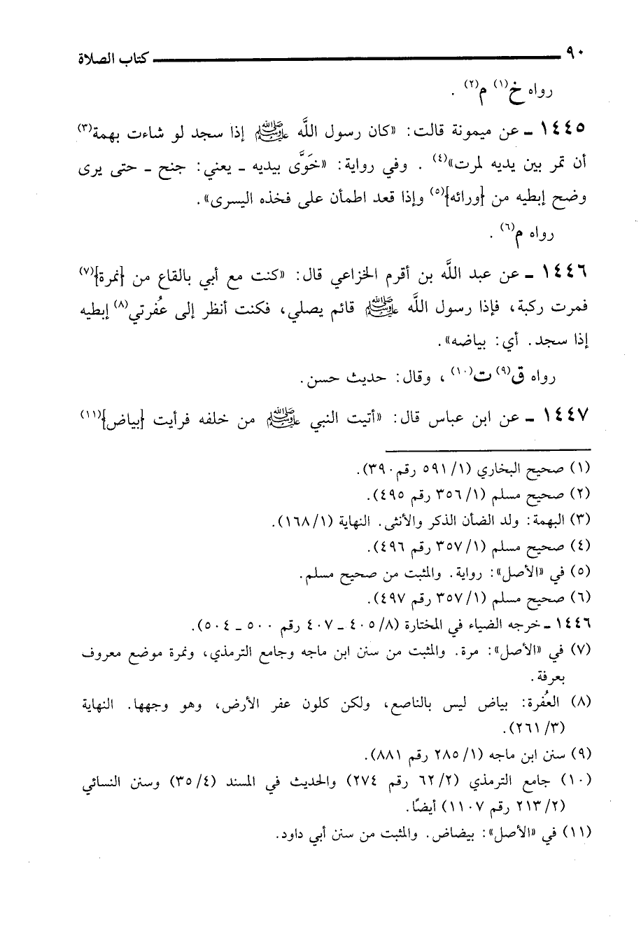 1446 - عن عبد الله بن أقرم الخزاعي قال: "كنت مع أبي بالقاع من (نمرة) (¬7) فمرت ركبة، فإذا رسول الله - صلى الله عليه وسلم - قائم يصلي، فكنت انظر إلى عُفرتي (¬8) إبطيه إذا سجد. أي: بياضه".