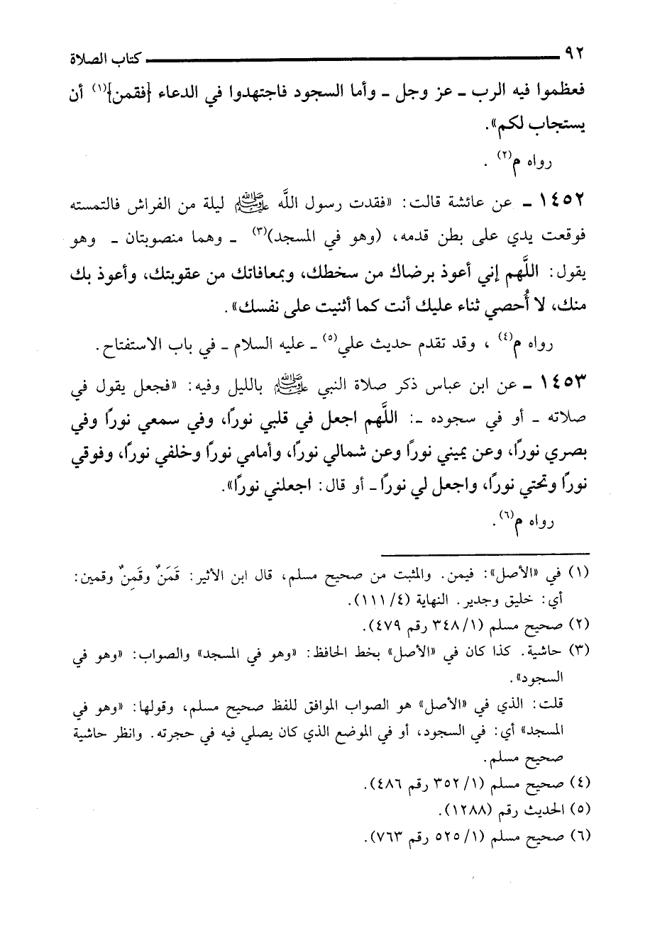 1452 - عن عائشة قالت: "فقدت رسول الله - صلى الله عليه وسلم - ليلة من الفراش فالتمسته فوقعت يدي على بطن قدمه، (وهو في المسجد) (¬3) -وهما منصوبتان- وهو يقول: اللهم إني أعوذ برضاك من سخطك، وبمعافاتك من عقوبتك، وأعوذ بك منك، لا أُحصي ثناء عليك أنت كما أثنيت على نفسك".