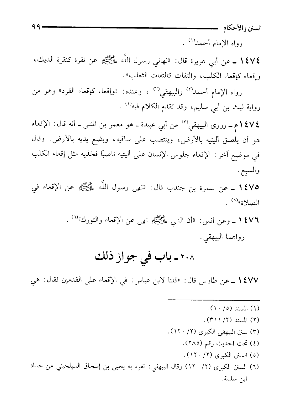 1475 - عن سمرة بن جندب قال: "نهى رسول الله - صلى الله عليه وسلم - عن الإقعاء في الصلاة" (¬5).