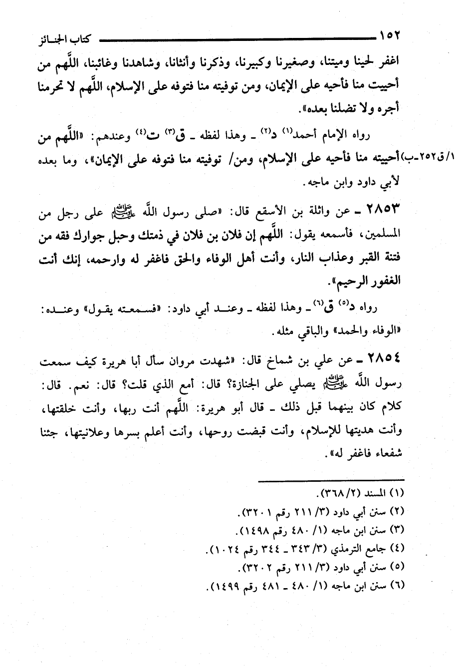 2854 - عن علي بن شماخ قال: "شهدت مروان سأل أبا هريرة كيف سمعت رسول الله - صلى الله عليه وسلم - يصلي على الجنازة؟ قال: أمع الذي قلت؟ قال: نعم. قال: كلام كان بينهما قبل ذلك -قال أبو هريرة: اللَّهم أنت ربها، وأنت خلقتها، وأنت هديتها للإسلام، وأنت قبضت روحها، وأنت أعلم بسرها وعلانيتها، جئنا شفعاء فاغفر له".