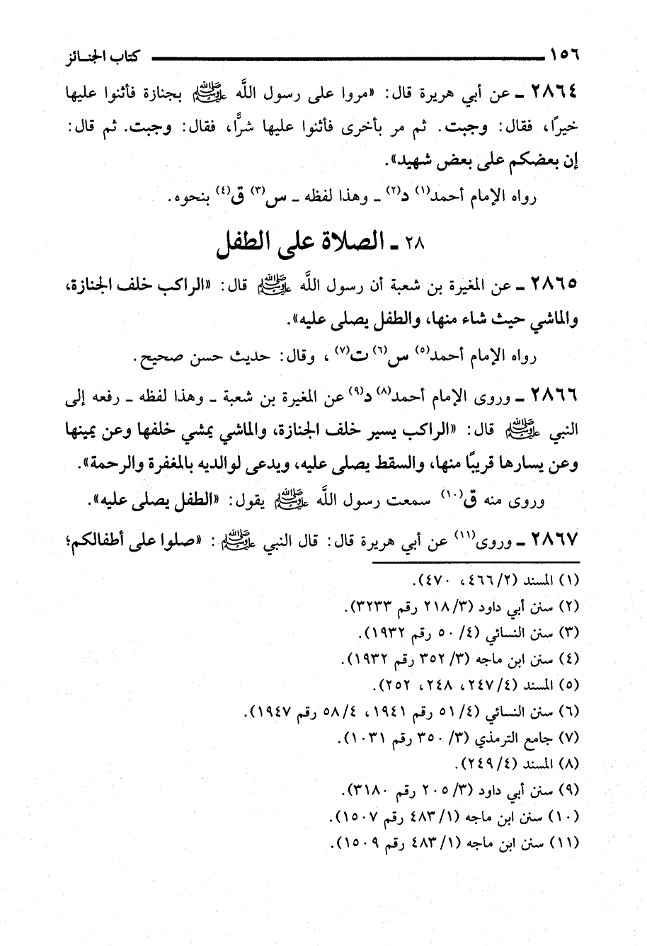 2865 - عن المغيرة بن شعبة أن رسول الله - صلى الله عليه وسلم - قال: "الراكب خلف الجنازة، والماشي حيث شاء منها، والطفل يصلى عليه".