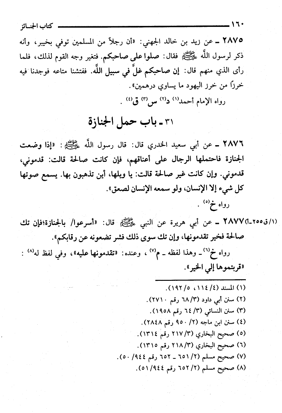 2875 - عن زيد بن خالد الجهني: "أن رجلاً من المسلمين توفي بخيبر، وأنه ذكر لرسول الله - صلى الله عليه وسلم - فقال: صلوا على صاحبكم. فتغير وجه القوم لذلك، فلما رأى الذي منهم قال: إن صاحبكم غلَّ في سبيل الله. ففتشنا متاعه فوجدنا فيه خرزًا من خرز اليهود ما يساوي درهمين".