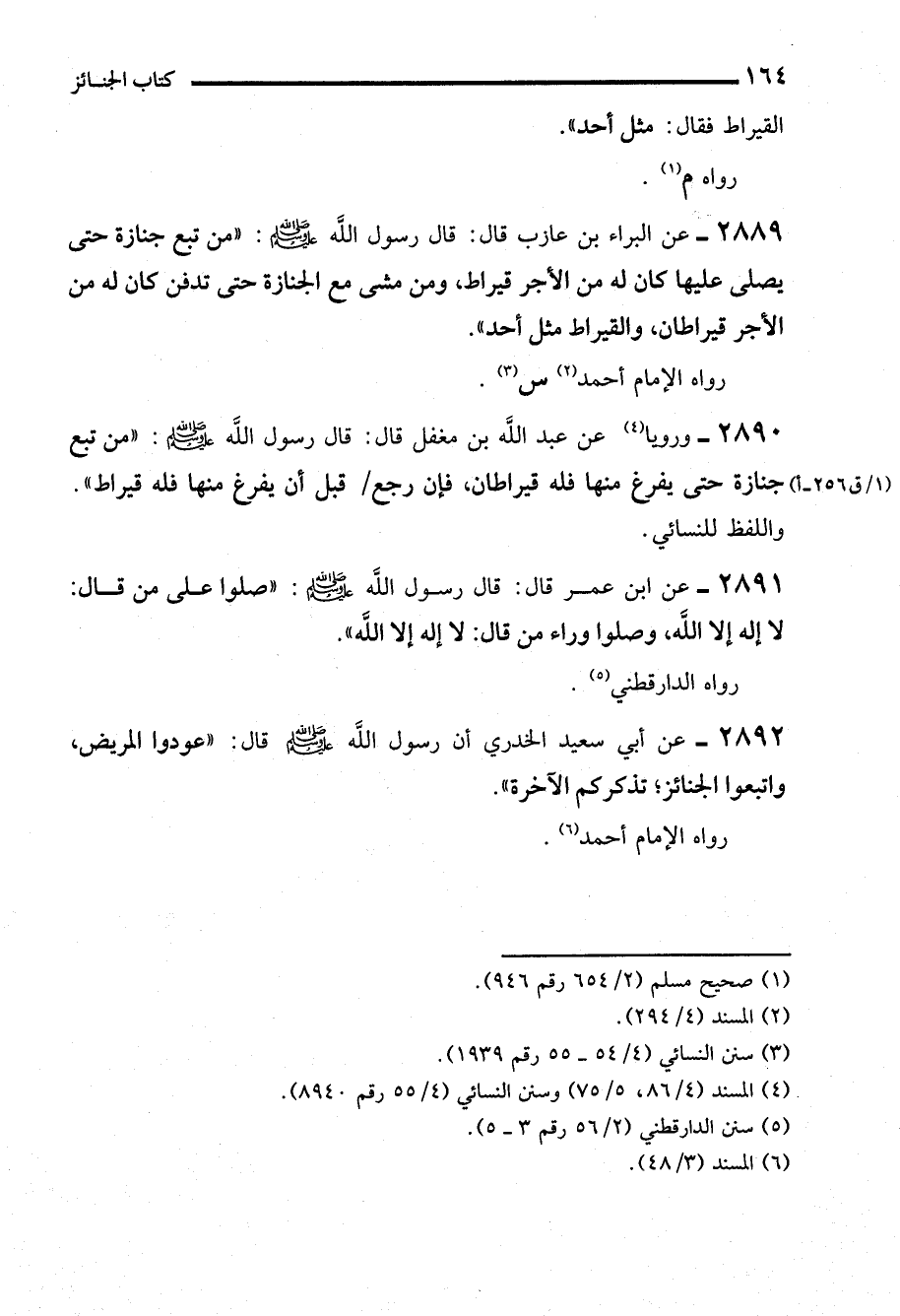 2889 - عن البراء بن عازب قال: قال رسول الله - صلى الله عليه وسلم -: "من تبع جنازة حتى يصلى عليها كان له من الأجر قيراط، ومن مشى مع الجنازة حتى تدفن كان له من الأجر قيراطان، والقيراط مثل أحد".