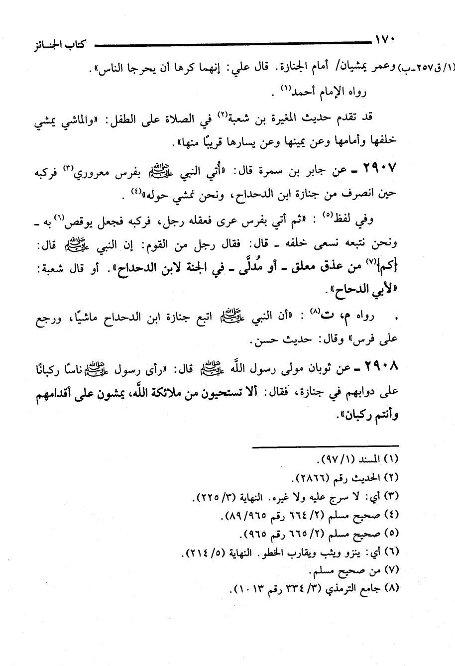 2907 - عن جابر بن سمرة قال: "أُتي النبي - صلى الله عليه وسلم - بفرس معروري (¬3) فركبه حين انصرف من جنازة ابن الدحداح، ونحن نمشي حوله" (¬4).