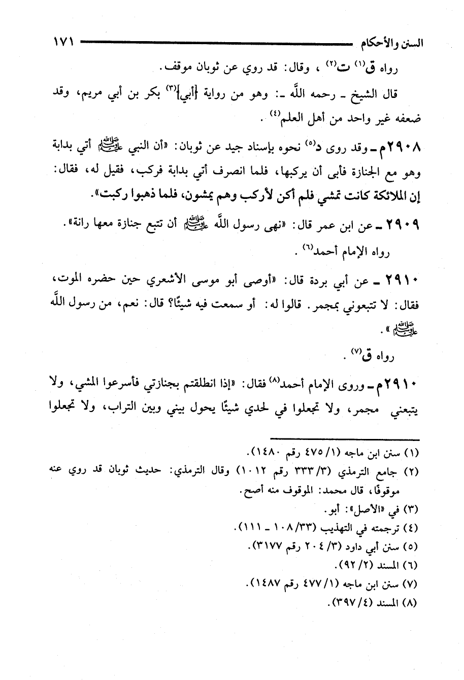 2908 م- وقد روى د (¬5) نحوه بإسناد جيد عن ثوبان: "أن النبي - صلى الله عليه وسلم - أتي بدابة وهو مع الجنازة فأبى أن يركبها، فلما انصرف أتي بدابة فركب، فقيل له، فقال: إن الملائكة كانت تمشي فلم أكن لأركب وهم يمشون، فلما ذهبوا ركبت".