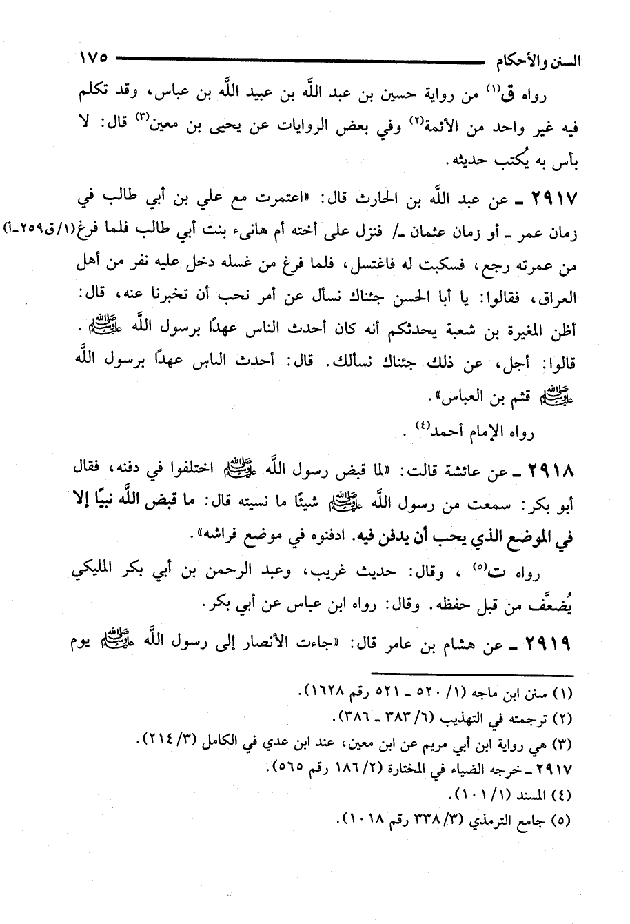 2917 - عن عبد الله بن الحارث قال: "اعتمرت مع علي بن أبي طالب في زمان عمر -أو زمان عثمان فنزل على أخته أم هانئ بنت أبي طالب فلما فرغ من عمرته رجع، فسكبت له فاغتسل، فلما فرغ من غسله دخل عليه نفر من أهل العراق، فقالوا: يا أبا الحسن جئناك نسأل عن أمر نحب أن تخبرنا عنه، قال: أظن المغيرة بن شعبة يحدثكم أنه كان أحدث الناس عهدًا برسول الله - صلى الله عليه وسلم -. قالوا: أجل، عن ذلك جئناك نسألك. قال: أحدث الناس عهدًا برسول الله - صلى الله عليه وسلم - قثم بن العباس".