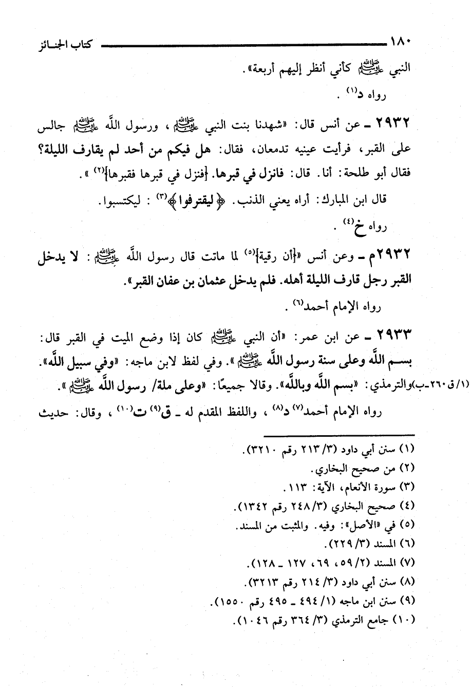 2933 - عن ابن عمر: "أن النبي - صلى الله عليه وسلم - كان إذا وضع الميت في القبر قال: بسم الله وعلى سنة رسول الله - صلى الله عليه وسلم -". وفي لفظ لابن ماجه: "وفي سبيل الله". والترمذي: "بسم الله وباللَّه". وقالا جميعًا: "وعلى ملة رسول الله - صلى الله عليه وسلم -".