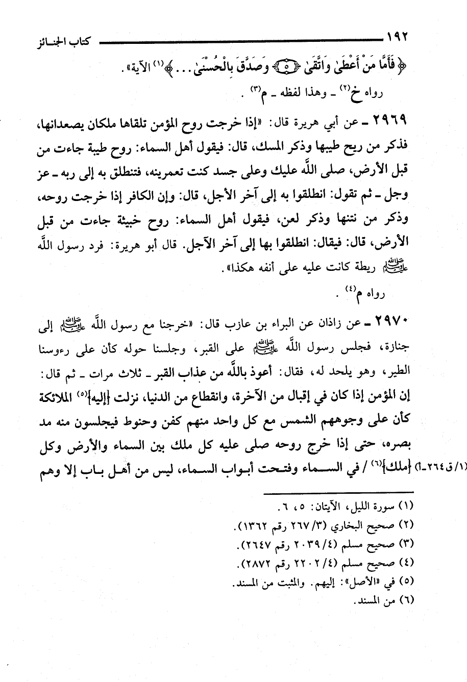 2969 - عن أبي هريرة قال: "إذا خرجت روح المؤمن تلقاها ملكان يصعدانها، فذكر من ريح طيبها وذكر المسك، قال: فيقول أهل السماء: روح طيبة جاءت من قبل الأرض، صلى الله عليك وعلى جسد كنت تعمرينه، فتنطلق به إلى ربه -عز وجل- ثم تقول: انطلقوا به إلى آخر الأجل، قال: وإن الكافر إذا خرجت روحه، وذكر من نتنها وذكر لعن، فيقول أهل السماء: روح خبيثة جاءت من قبل الأرض، قال: فيقال: انطلقوا بها إلى آخر الآجل. قال أبو هريرة: فرد رسول الله - صلى الله عليه وسلم - ريطة كانت عليه على أنفه هكذا".