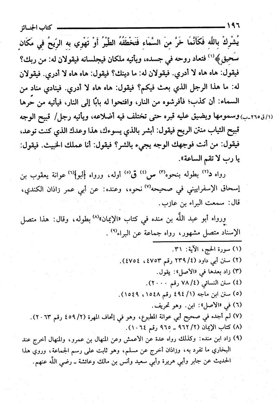 رواه د (¬2) بطوله بنحوه (¬3) س (¬4) ق (¬5) أوله، ورواه (أبو) (¬6) عوانة يعقوب بن إسحاق الإسفراييني في صحيحه (¬7) نحوه، وعنده: عن أبي عمر زاذان الكندي، قال: سمعت البراء بن عازب.