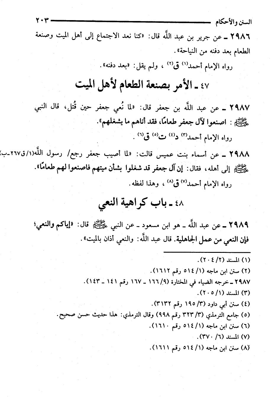 2986 - عن جرير بن عبد الله قال: "كنا نعد الاجتماع إلى أهل الميت وصنعة الطعام بعد دفنه من النياحة".
