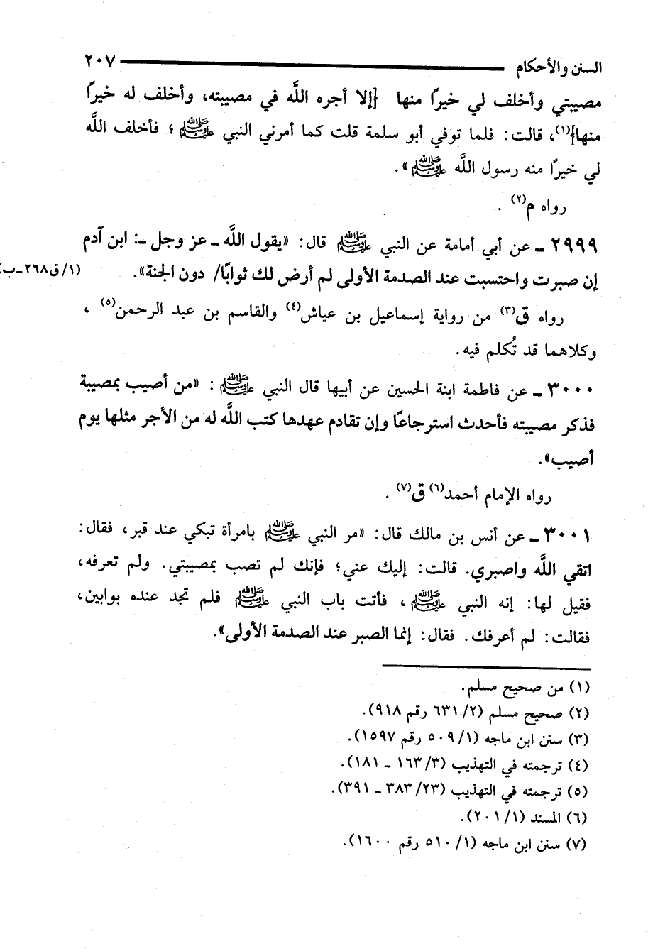 3001 - عن أنس بن مالك قال: "مر النبي - صلى الله عليه وسلم - بامرأة تبكي عند قبر، فقال: اتقي الله واصبري. قالت: إليك عني؛ فإنك لم تصب بمصيبتي. ولم تعرفه، فقيل لها: إنه النبي - صلى الله عليه وسلم -، فأتت باب النبي - صلى الله عليه وسلم - فلم تجد عنده بوابين، فقالت: لم أعرفك. فقال: إنما الصبر عند الصدمة الأولى".