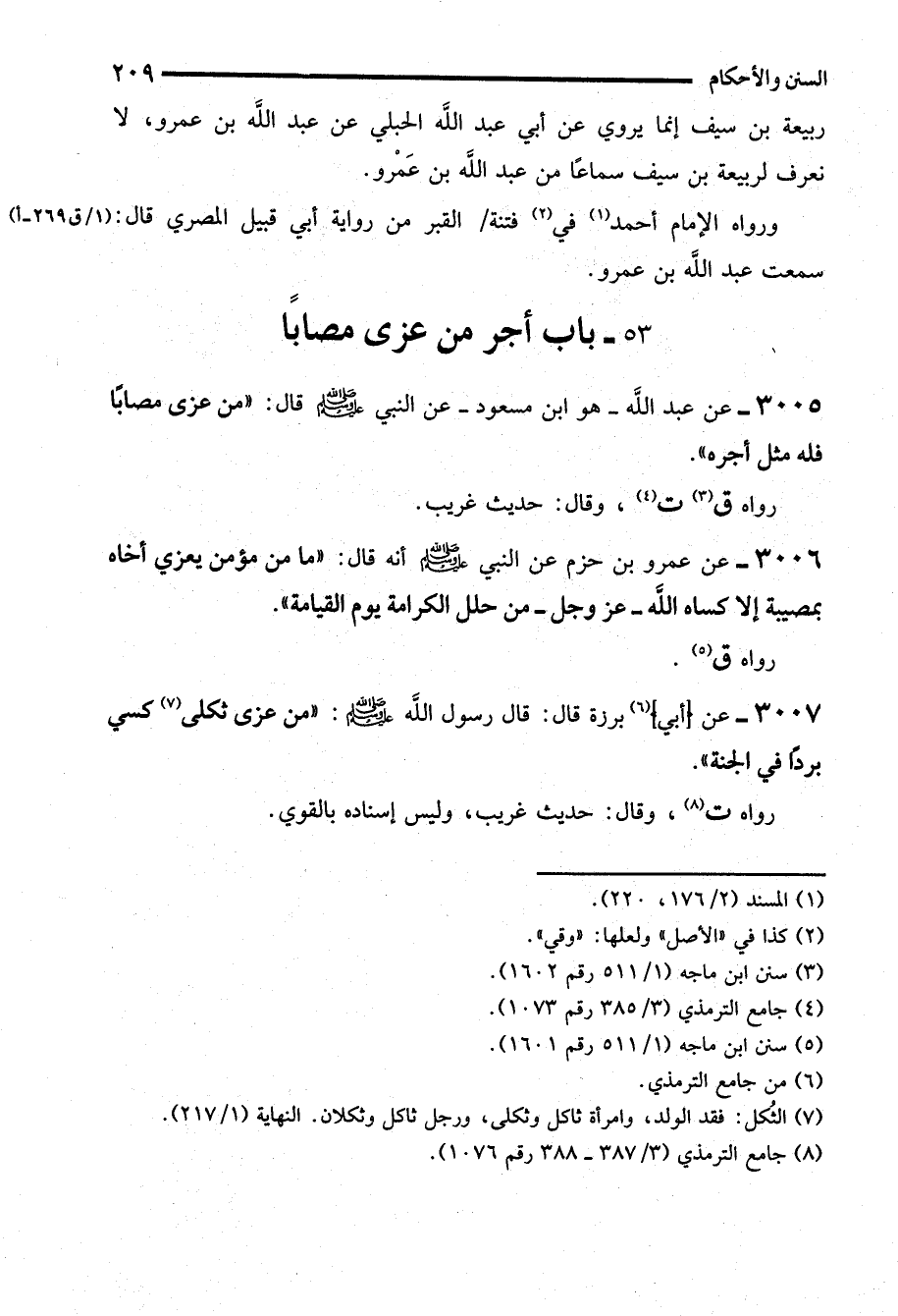 3006 - عن عمرو بن حزم عن النبي - صلى الله عليه وسلم - أنه قال: "ما من مؤمن يعزي أخاه بمصيبة إلا كساه الله -عز وجل- من حلل الكرامة يوم القيامة".