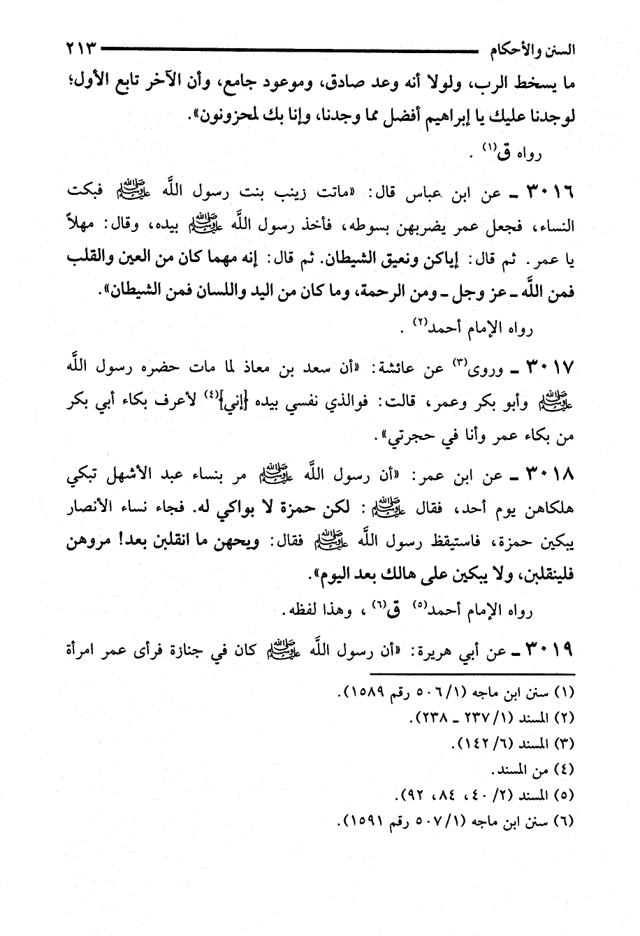 3016 - عن ابن عباس قال: "ماتت زينب بنت رسول الله - صلى الله عليه وسلم - فبكت النساء، فجعل عمر يضربهن بسوطه، فأخذ رسول الله - صلى الله عليه وسلم - بيده، وقال: مهلًا يا عمر. ثم قال: إياكن ونعيق الشيطان. ثم قال: إنه مهما كان من العين والقلب فمن الله -عز وجل- ومن الرحمة، وما كان من اليد واللسان فمن الشيطان".