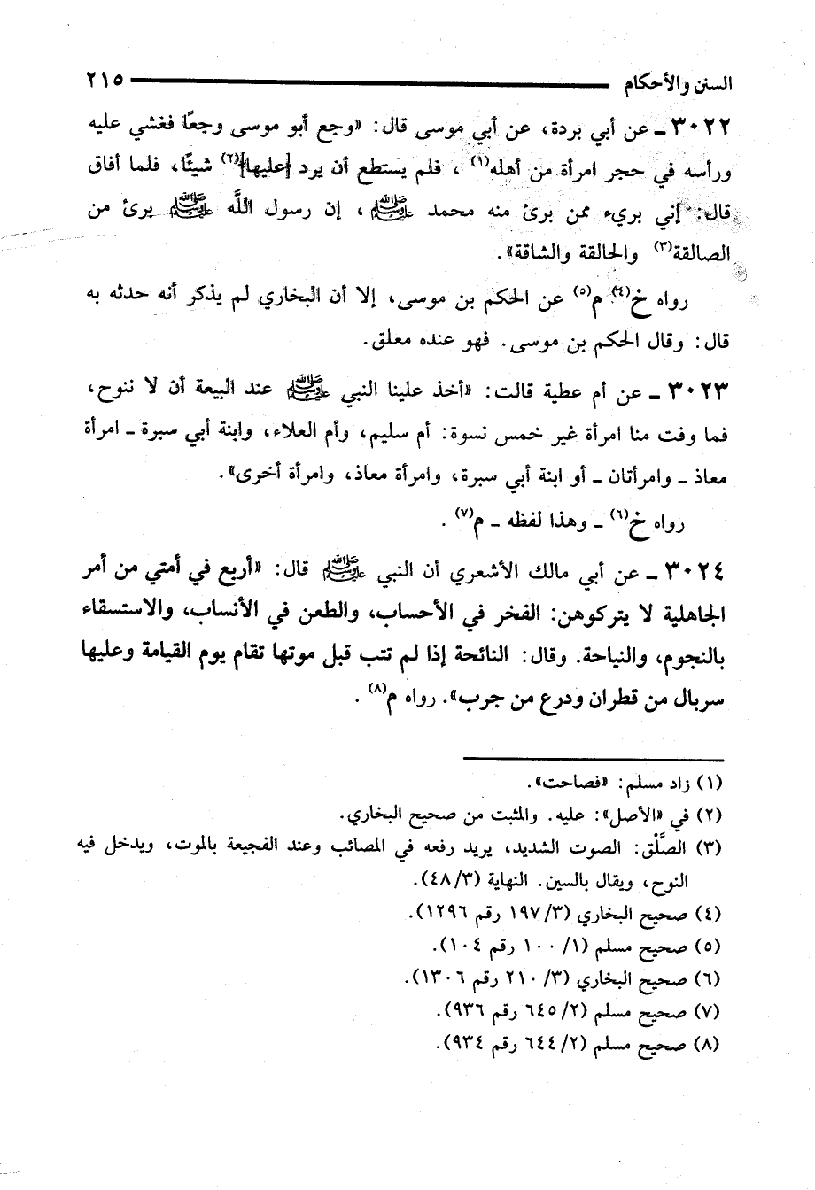 3022 - عن أبي بردة، عن أبي موسى قال: "وجع أبو موسى وجعًا فغشي عليه ورأسه في حجر امرأة من أهله (¬1)، فلم يستطع أن يرد (عليها) (¬2) شيئاً، فلما أفاق قال: إني بريء ممن برئ منه محمد - صلى الله عليه وسلم -، إن رسول الله - صلى الله عليه وسلم - برئ من الصالقة (¬3) والحالقة والشاقة".