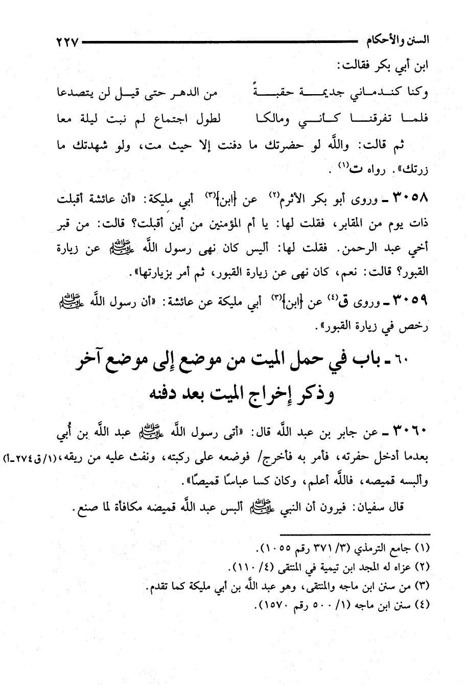 3059 - وروى ق (¬4) عن (ابن) (3) أبي مليكة عن عائشة: "أن رسول الله - صلى الله عليه وسلم - رخص في زيارة القبور".