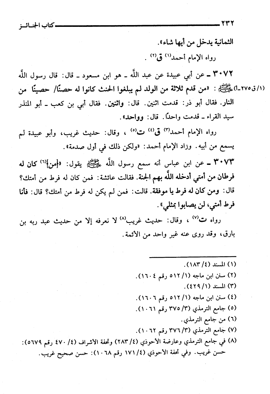 3072 - عن أبي عبيدة عن عبد الله -هو ابن مسعود- قال: قال رسول الله - صلى الله عليه وسلم -: "من قدم ثلاثة من الولد لم يبلغوا الحنث كانوا له حصنًا حصينًا من النار. فقال أبو ذر: قدمت اثنين. قال: واثنين. فقال أبي بن كعب -أبو المنذر سيد القراء- قدمت واحدًا. قال: وواحد".