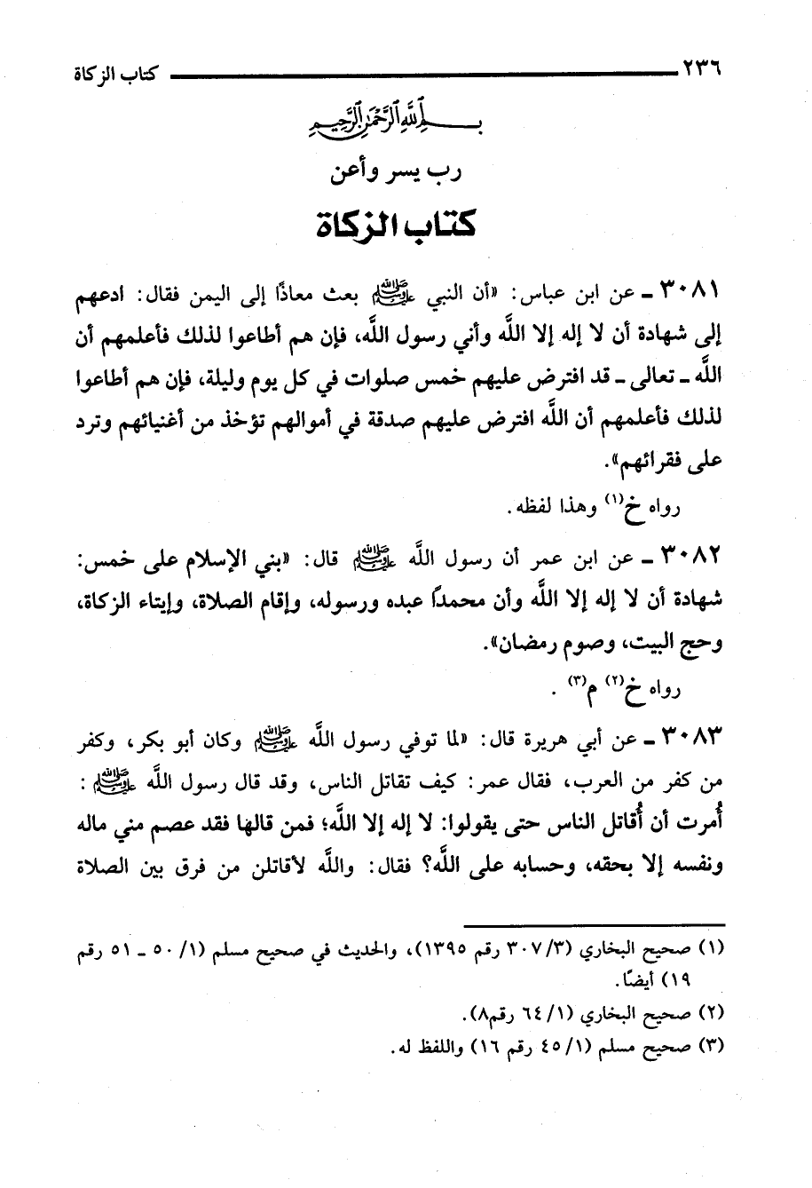 3081 - عن ابن عباس: "أن النبي - صلى الله عليه وسلم - بعث معاذًا إلى اليمن فقال: ادعهم إلى شهادة أن لا إله إلا الله وأني رسول الله، فإن هم أطاعوا لذلك فأعلمهم أن الله -تعالى- قد افترض عليهم خمس صلوات في كل يوم وليلة، فإن هم أطاعوا لذلك فأعلمهم أن الله افترض عليهم صدقة في أموالهم تؤخذ من أغنيائهم وترد على فقرائهم".
