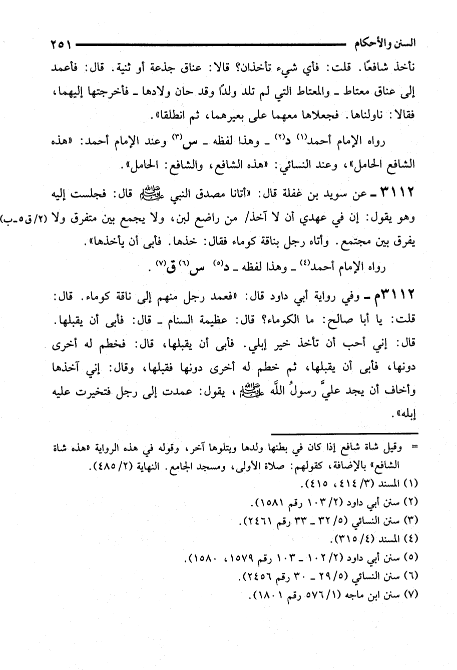 3112م- وفي رواية أبي داود قال: "فعمد رجل منهم إلى ناقة كوماء. قال: قلت: يا أبا صالح: ما الكوماء؟ قال: عظيمة السنام -قال: فأبى أن يقبلها. قال: إني أحب أن تأخذ خير إبلي. فأبى أن يقبلها، قال: فخطم له أخرى دونها، فأبى أن يقبلها، ثم خطم له أخرى دونها فقبلها، وقال: إني آخذها وأخاف أن يجد عليَّ رسولُ الله - صلى الله عليه وسلم -، يقول: عمدت إلى رجل فتخيرت عليه إبله".
