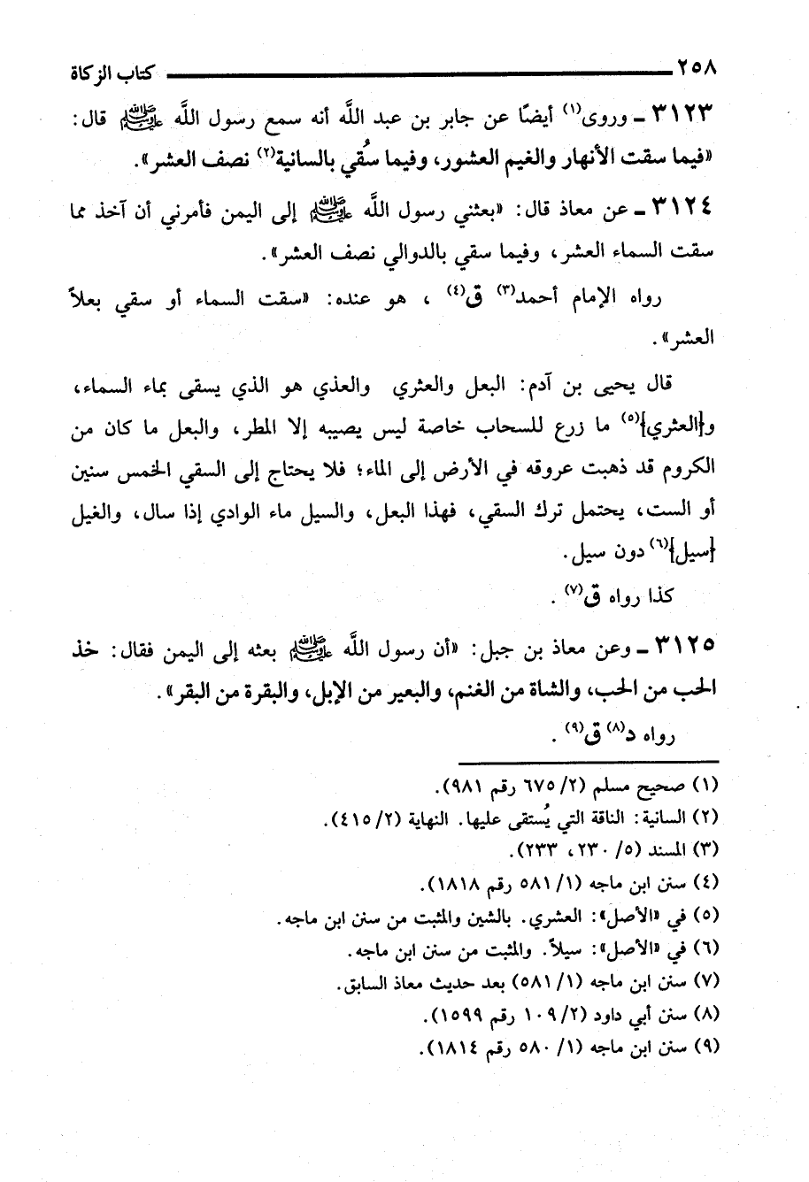 3123 - وروى (¬1) أيضًا عن جابر بن عبد الله أنه سمع رسول الله - صلى الله عليه وسلم - قال: "فيما سقت الأنهار والغيم العشور، وفيما سُقي بالسانية (¬2) نصف العشر".