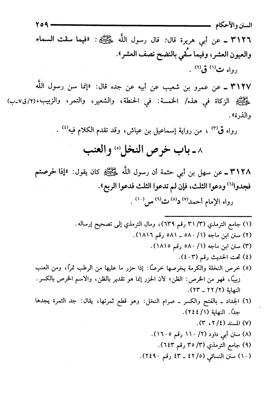 3126 - عن أبي هريرة قال: قال رسول الله - صلى الله عليه وسلم - "فيما سقت السماء والعيون العشر، وفيما سُقي بالنضح نصف العشر".