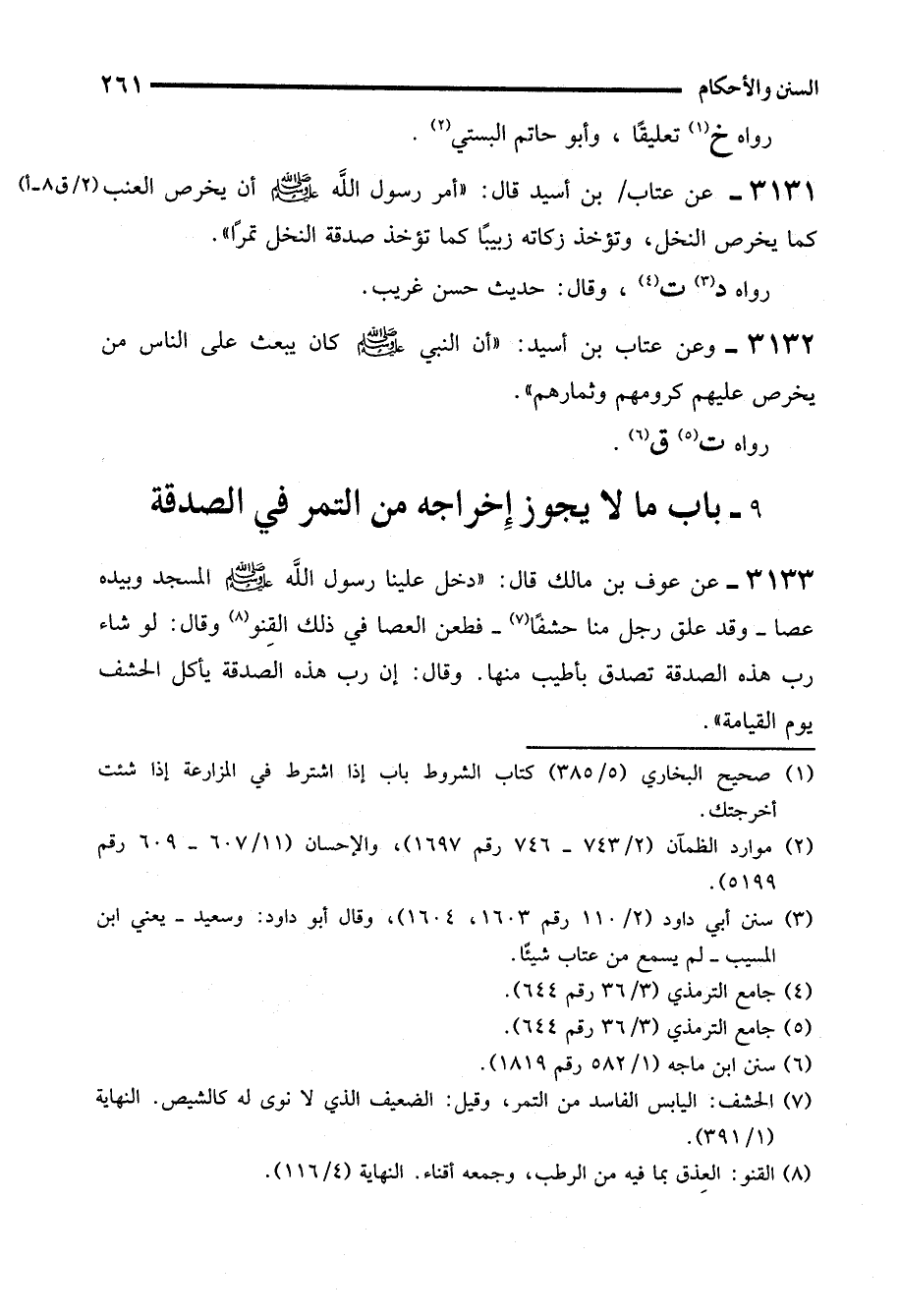 3132 - وعن عتاب بن أسيد: "أن النبي - صلى الله عليه وسلم - كان يبعث على الناس من يخرص عليهم كرومهم وثمارهم".