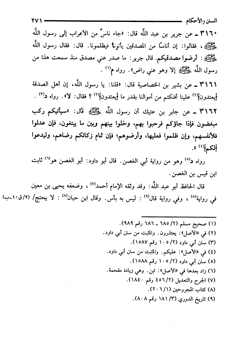 3160 - عن جرير بن عبد الله قال: "جاء ناسٌ من الأعراب إلى رسول الله - صلى الله عليه وسلم - فقالوا: إن أناساً من المصدقين يأتونا فيظلمونا. قال: فقال رسول الله - صلى الله عليه وسلم -: أرضوا مصدقيكم. قال جرير: ما صدر عني مصدق منذ سمعت هذا من رسول الله - صلى الله عليه وسلم - إلا وهو عني راض". رواه م (¬1).