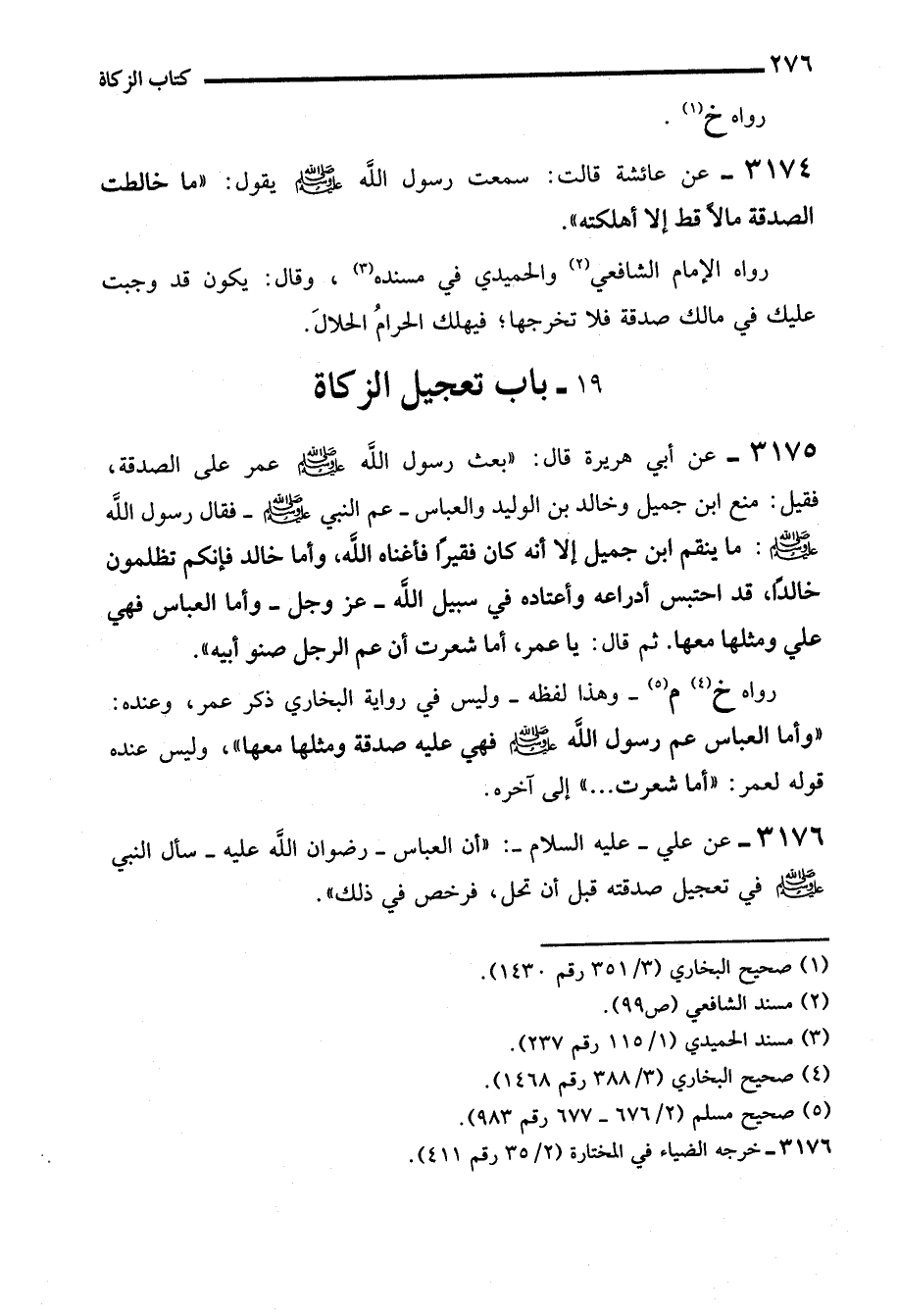 3176 - عن علي -رضي الله عنه-: "أن العباس- رضوان الله عليه- سأل النبي - صلى الله عليه وسلم - في تعجيل صدقته قبل أن تحل، فرخص في ذلك".