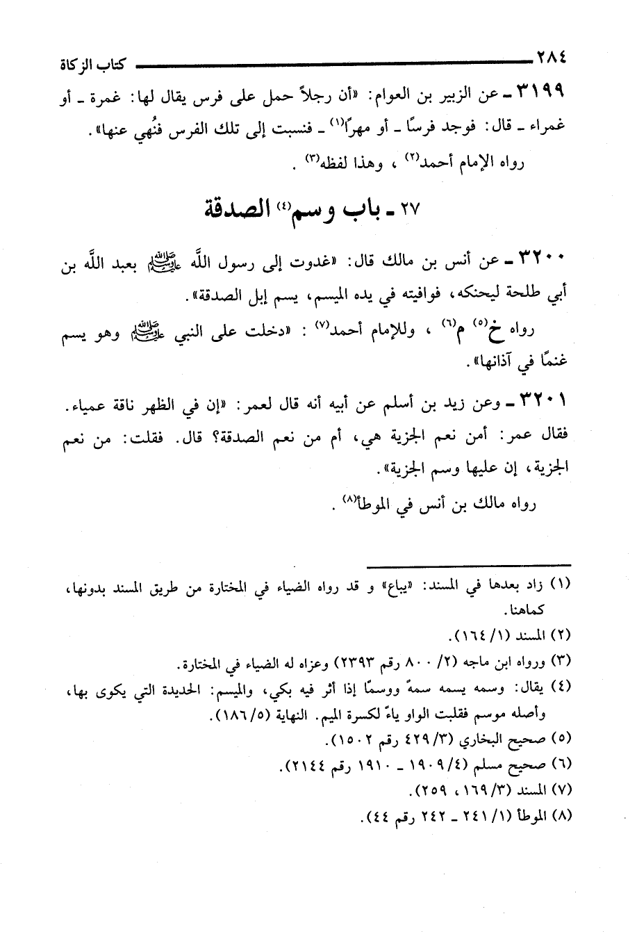 3201 - وعن زيد بن أسلم عن أبيه أنه قال لعمر: "إن في الظهر ناقة عمياء. فقال عمر: أمن نعم الجزية هي، أم من نعم الصدقة؟ قال. فقلت: من نعم الجزية، إن عليها وسم الجزية".