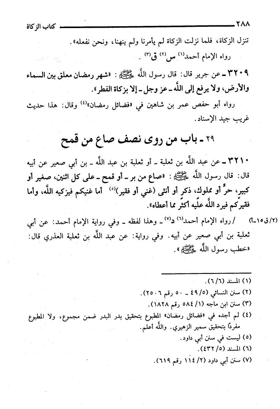 3210 - عن عبد الله بن ثعلبة -أو ثعلبة بن عبد الله- بن أبي صعير عن أبيه قال: قال رسول الله - صلى الله عليه وسلم -: "صاع من بر -أو قمح- على كل اثنين، صغير أو كبير، حرٍّ أو مملوك، ذكر أو أنثى (غني أو فقير) (¬5) أما غنيكم فيزكيه الله، وأما فقيركم فيرد الله عليه أكثر مما أعطاه".