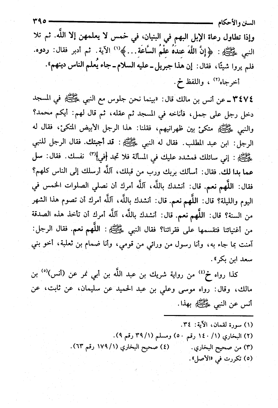 3474 - عن أنس بن مالك قال: "بينما نحن جلوس مع النبي - صلى الله عليه وسلم - في المسجد دخل رجل على جمل، فأناخه في المسجد ثم عقله، ثم قال لهم: أيكم محمد؟ والنبي - صلى الله عليه وسلم - متكئ بين ظهرانيهم، فقلنا: هذا الرجل الأبيض المتكئ، فقال له الرجل: ابن عبد المطلب. فقال له النبي - صلى الله عليه وسلم -: قد أجبتك. فقال الرجل للنبي - صلى الله عليه وسلم -: إني سائلك فمشدد عليك في المسألة فلا تجد (في) (¬3) نفسك. فقال: سل عما بدا لك. فقال: أسألك بربك ورب من قبلك، آللَّه أرسلك إلى الناس كلهم؟ فقال: اللَّهم نعم. قال: أنشدك بالله، آللَّه أمرك أن نصلي الصلوات الخمس في اليوم والليلة؟ قال: اللَّهم نعم. قال: أنشدك بالله، آلله أمرك أن تصوم هذا الشهر من السنة؟ قال: اللَّهم نعم. قال: أنشدك باللَّه، آلله أمرك أن تأخذ هذه الصدقة من أغنيائنا فتقسمها على فقرائنا؟ فقال النبي - صلى الله عليه وسلم -: اللَّهم نعم. فقال الرجل: آمنت بما جاء به، وأنا رسول من ورائي من قومي، وأنا ضمام بن ثعلبة، أخو بني سعد ابن بكر".