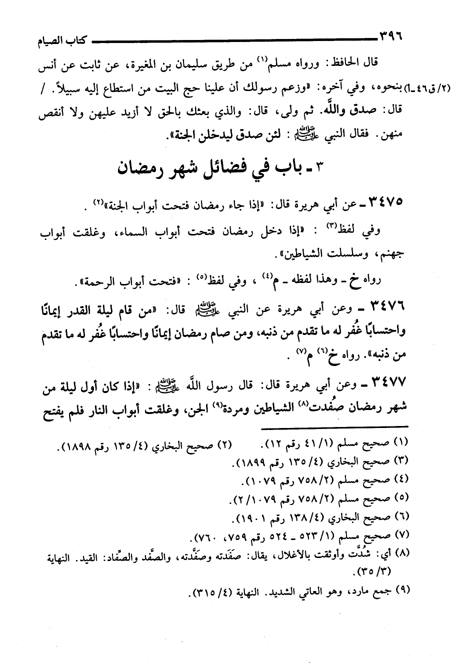 3477 - وعن أبي هريرة قال: قال رسول الله - صلى الله عليه وسلم -: "إذا كان أول ليلة من شهر رمضان صُفدت (¬8) الشياطين ومردة (¬9) الجن، وغلقت أبواب النار فلم يفتح
