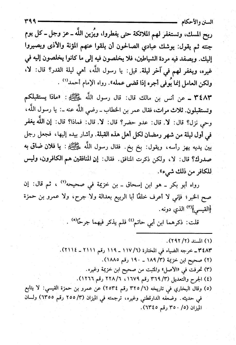 3483 - عن أنس بن مالك قال: قال رسول الله - صلى الله عليه وسلم -: "ماذا يستقبلكم وتستقبلون. ثلاث مرات، فقال عمر بن الخطاب -رضي الله عنه-: يا رسول الله، وحي نزل؟ قال: لا. قال: عدو حضر؟ قال: لا. قال: فماذا؟ قال: إن الله يغفر في أول ليلة من شهر رمضان لكل أهل هذه القبلة. وأشار بيده إليها، فجعل رجل بين يديه يهز رأسه، ويقول: بخ بخ. فقال رسول الله - صلى الله عليه وسلم -: يا فلان ضاق به صدرك؟ قال: لا، ولكن ذكرت المنافق. فقال: إن المنافقين هم الكافرون، وليس للكافر من ذلك شيء".